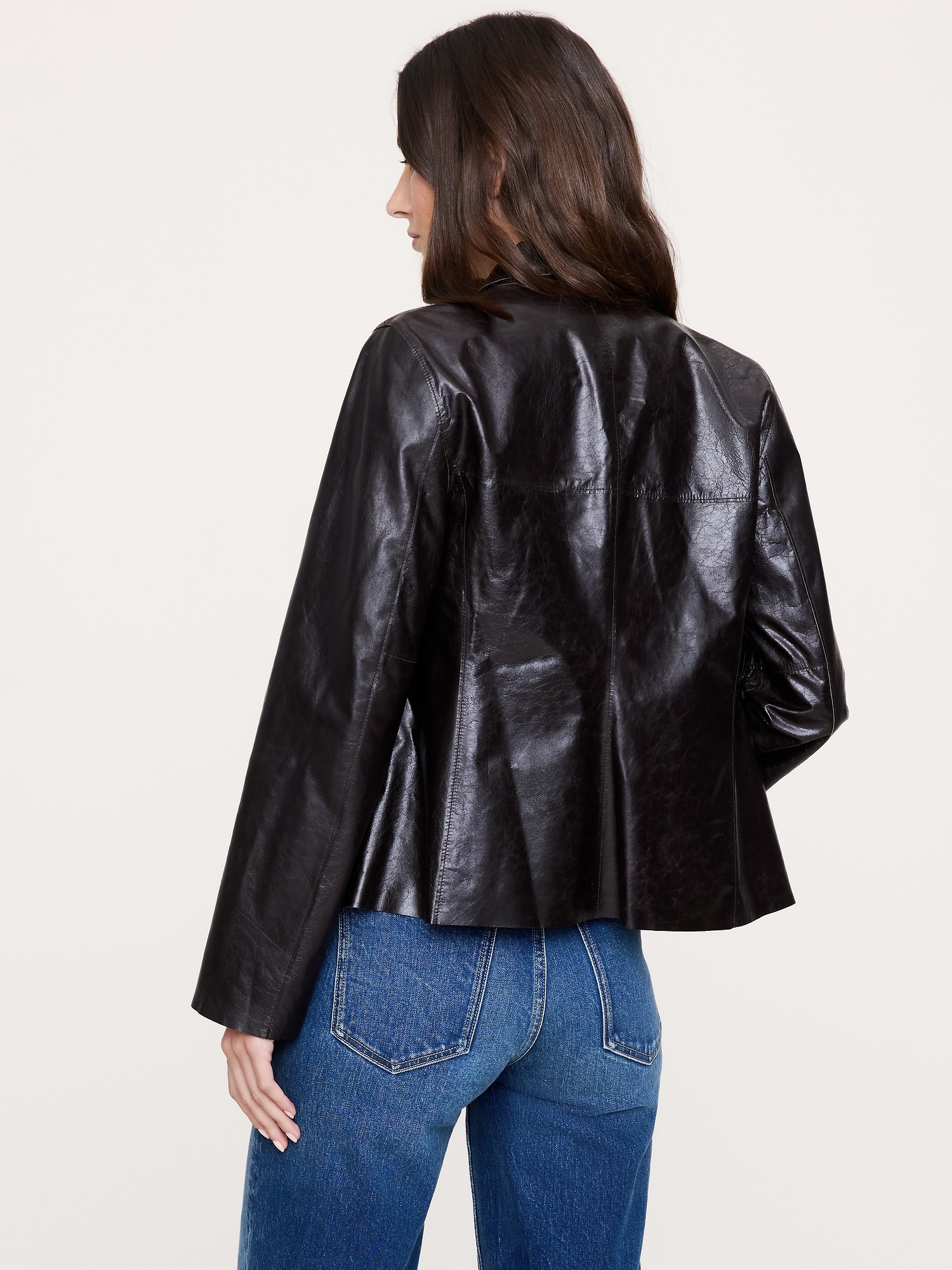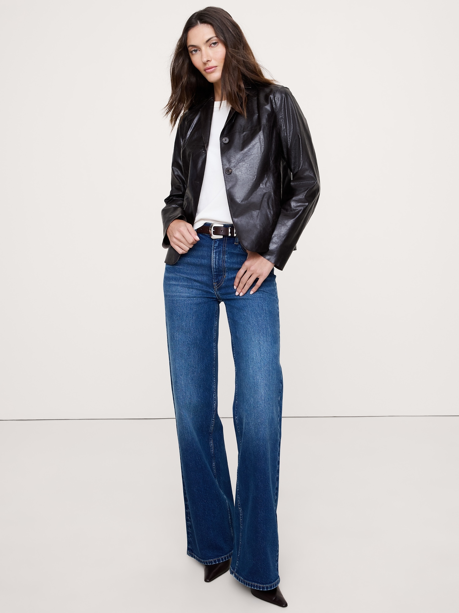 We looked to the archives to style this luxurious leather blazer. The style itself is classic and the silhouette is minimalist because the lambskin leather here is so special.