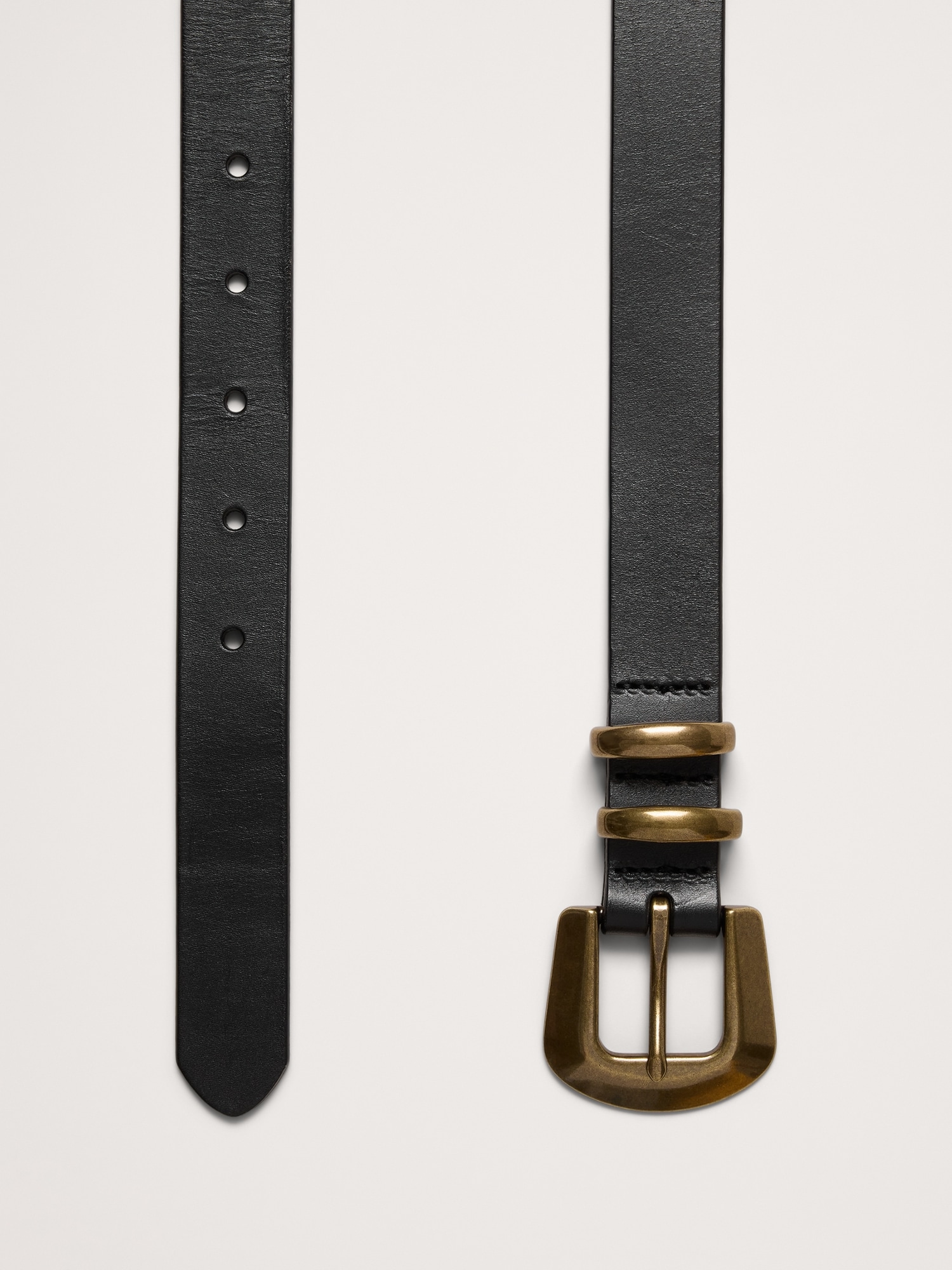 Designed and fitted to be worn on the hips, this skinny-width belt is crafted from a sturdy cut of leather and secured with a single buckle with beveled edges.