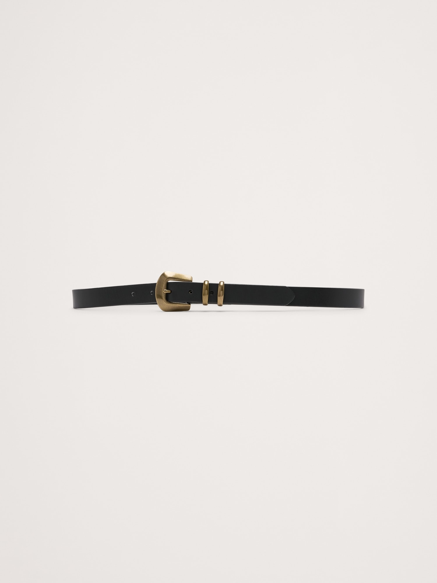 Designed and fitted to be worn on the hips, this skinny-width belt is crafted from a sturdy cut of leather and secured with a single buckle with beveled edges.