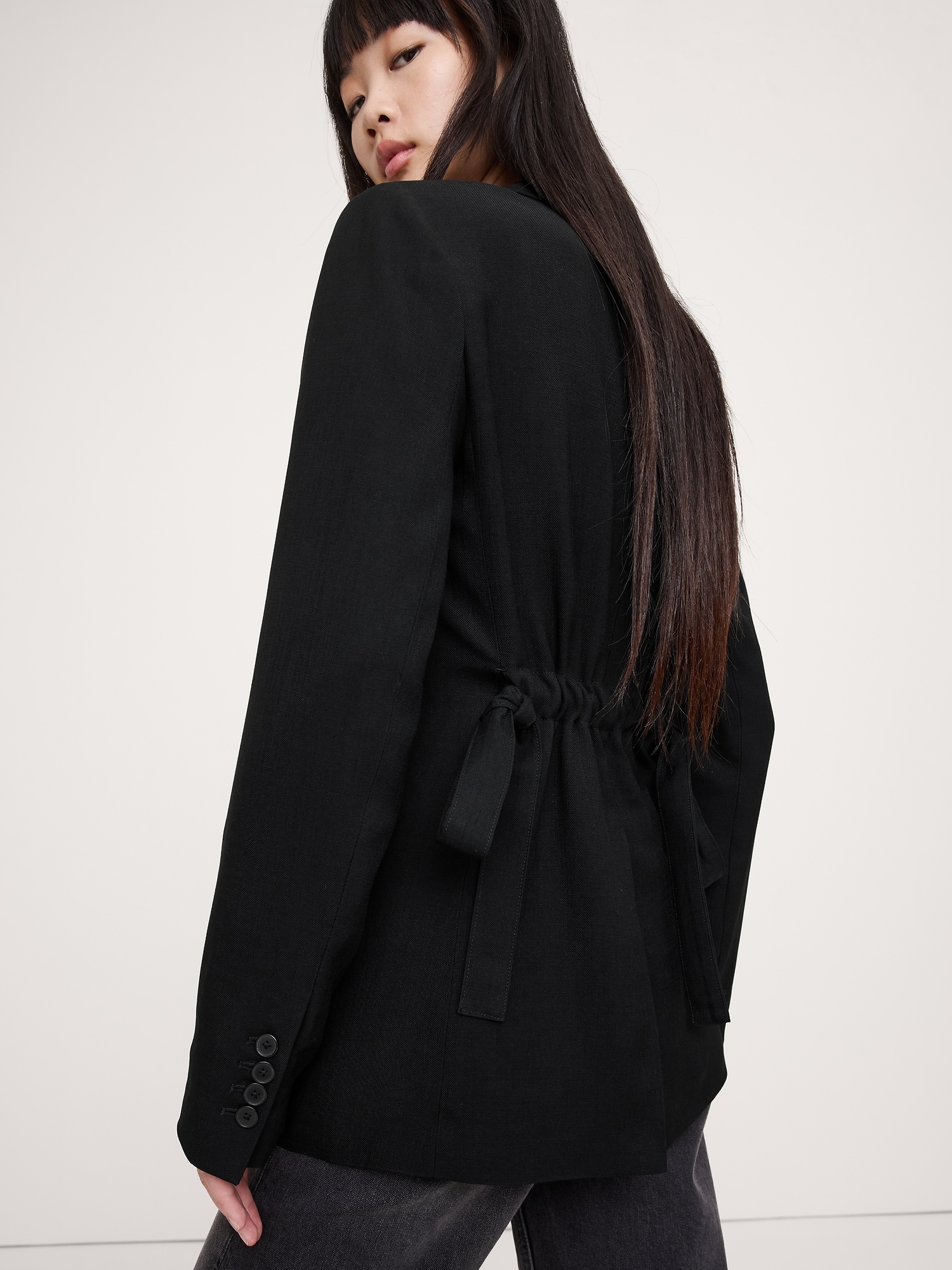 The vibe here is relaxed, yet put-together. We cut blazer in an easy, boyfriend fit using our premium drapey twill—a fabric we love because it strikes the perfect balance between tailored and casual-cool. Plus, we added an adjustable belt at the back to define the waist.