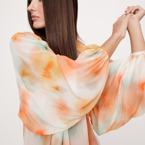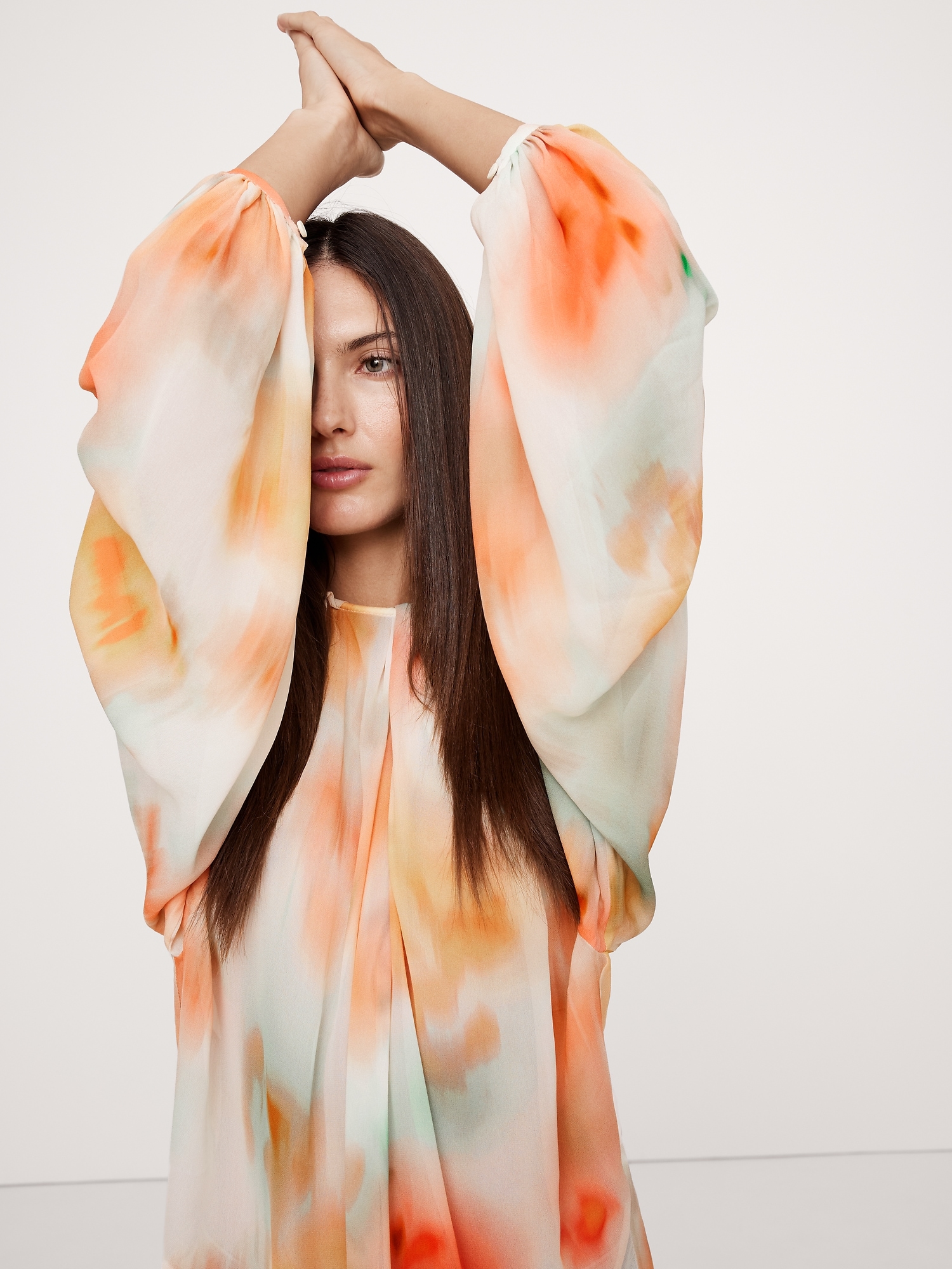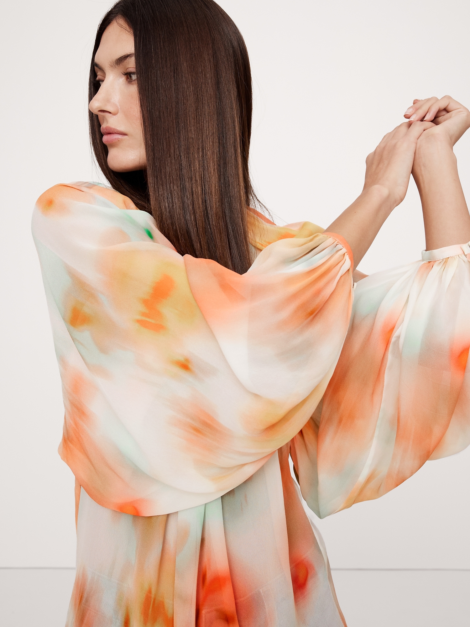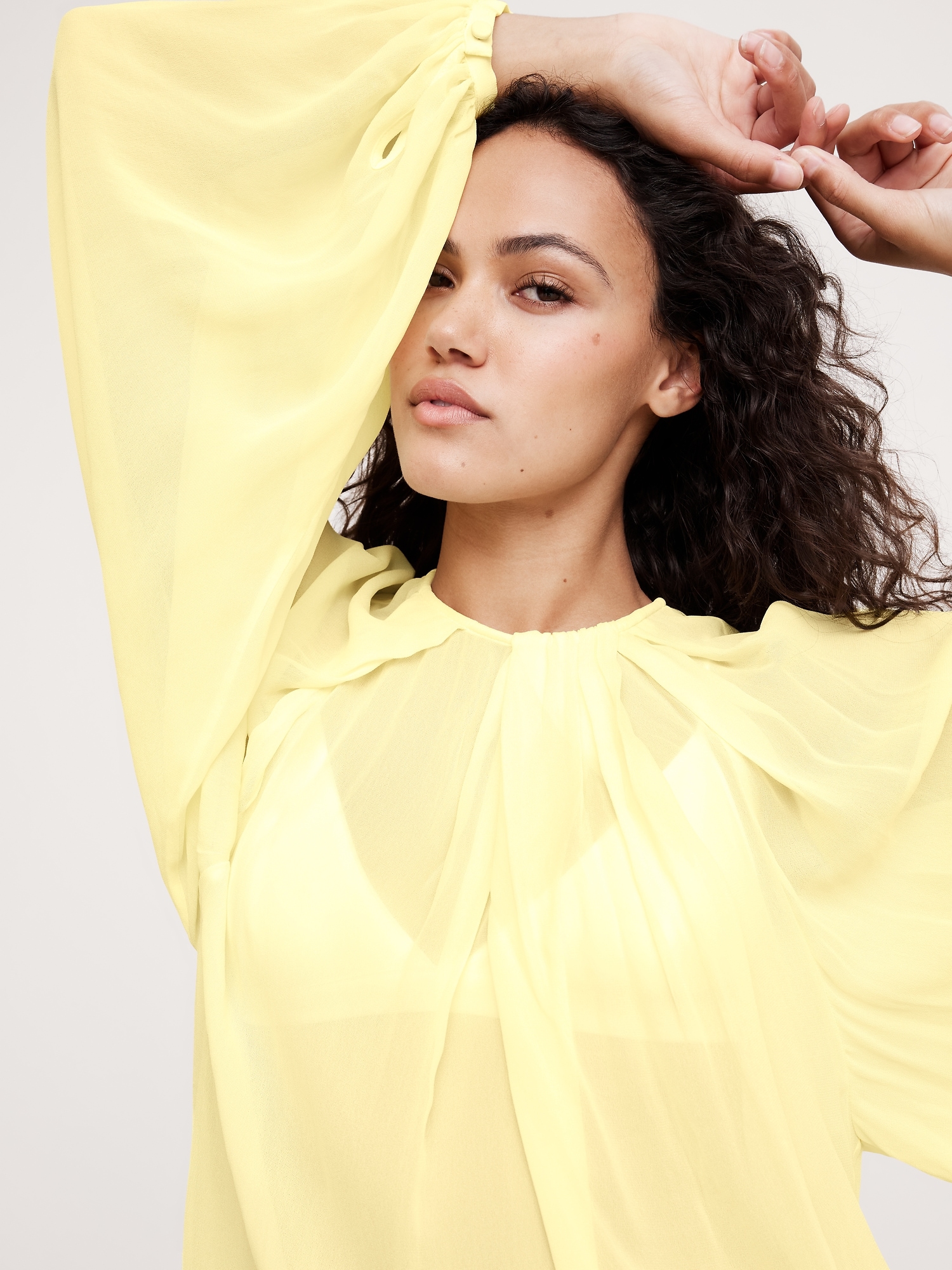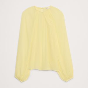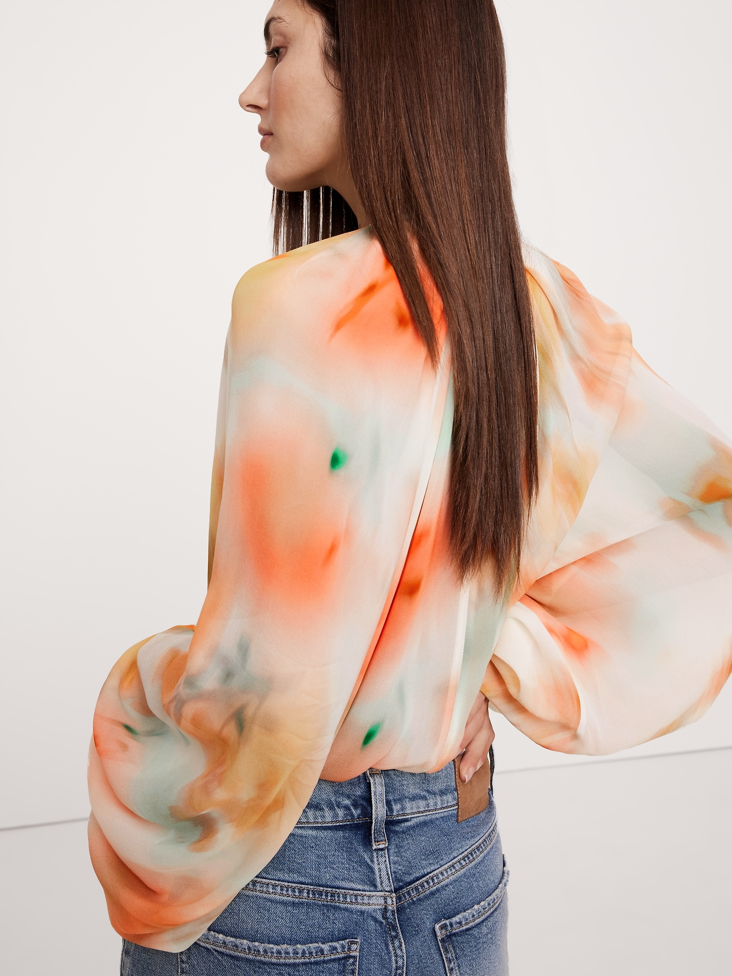 Designed with an easy fit that’s relaxed from the shoulders to the hem, this blouse has a shorter length paired with feminine, balloon sleeves and a chiffon construction. We love the twisted detail at the neck.