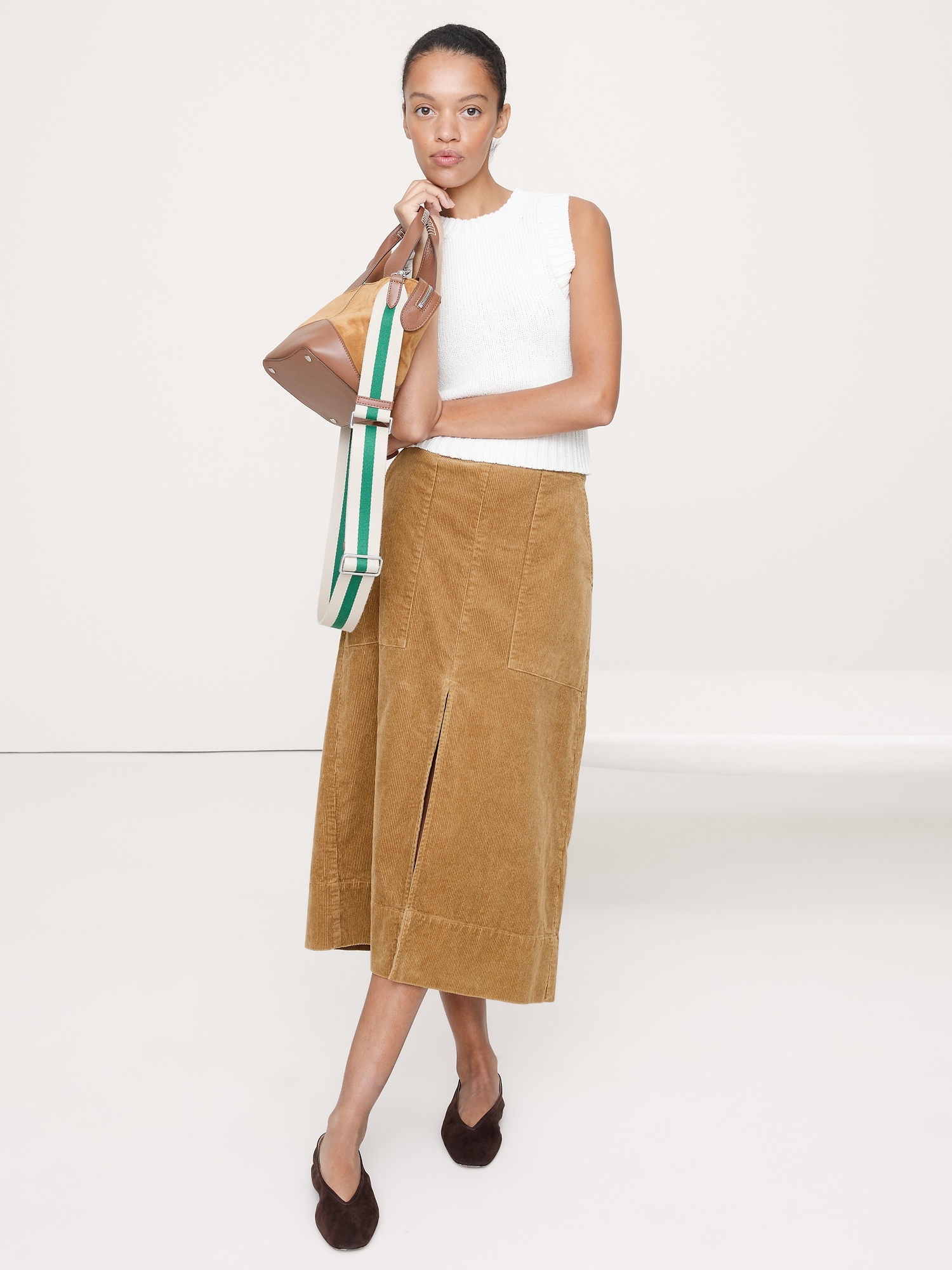 Nothing says cold weather quite like corduroy. Here, we crafted a tailored midi skirt with front and back slits—the better to show off your shoes.