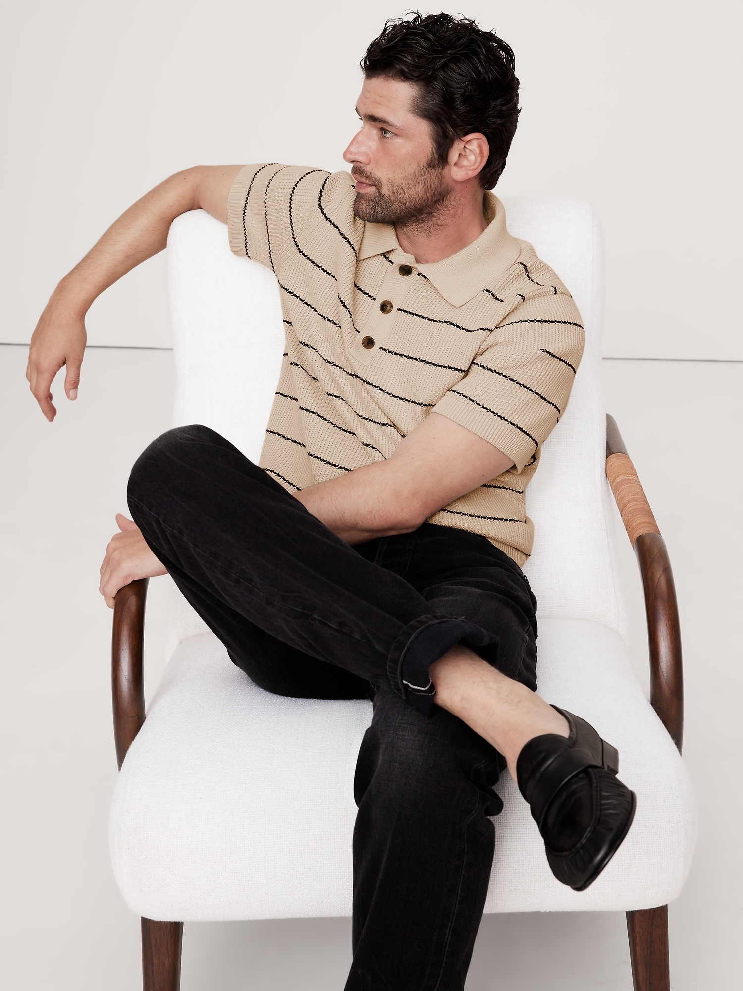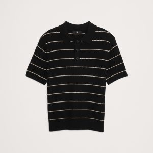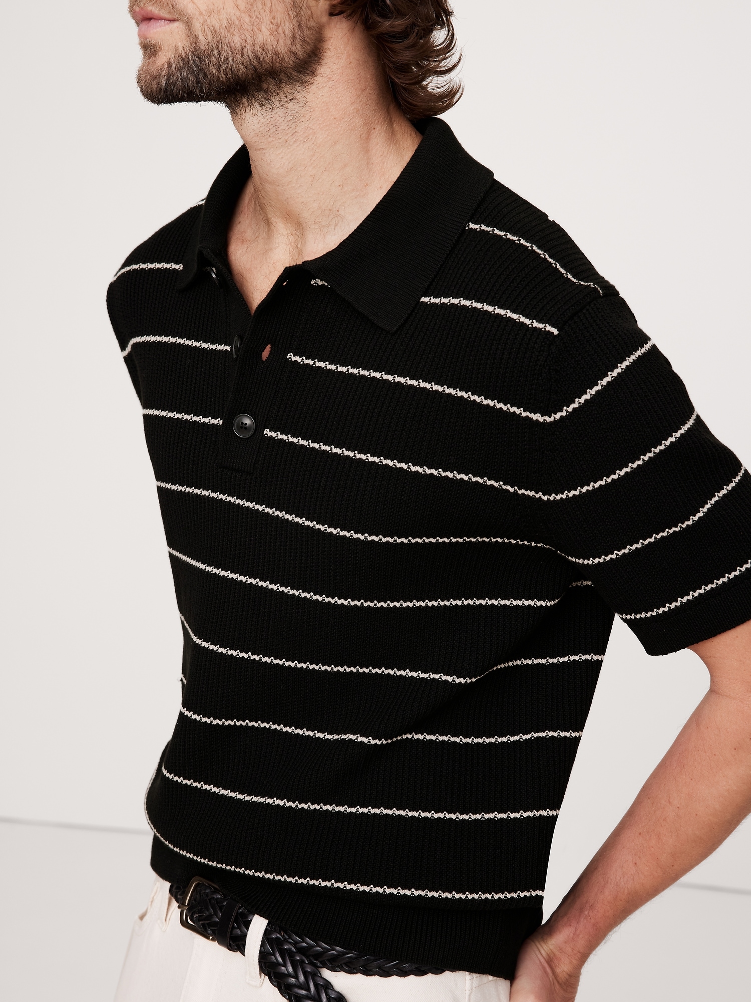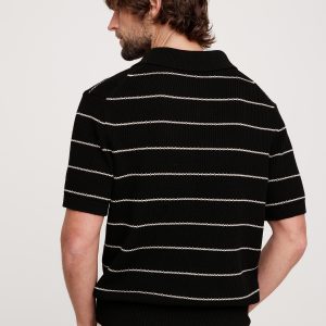 This soft sweater polo is crafted from a cotton blend yarn using a variety of stitches to add a retro-inspired texture.