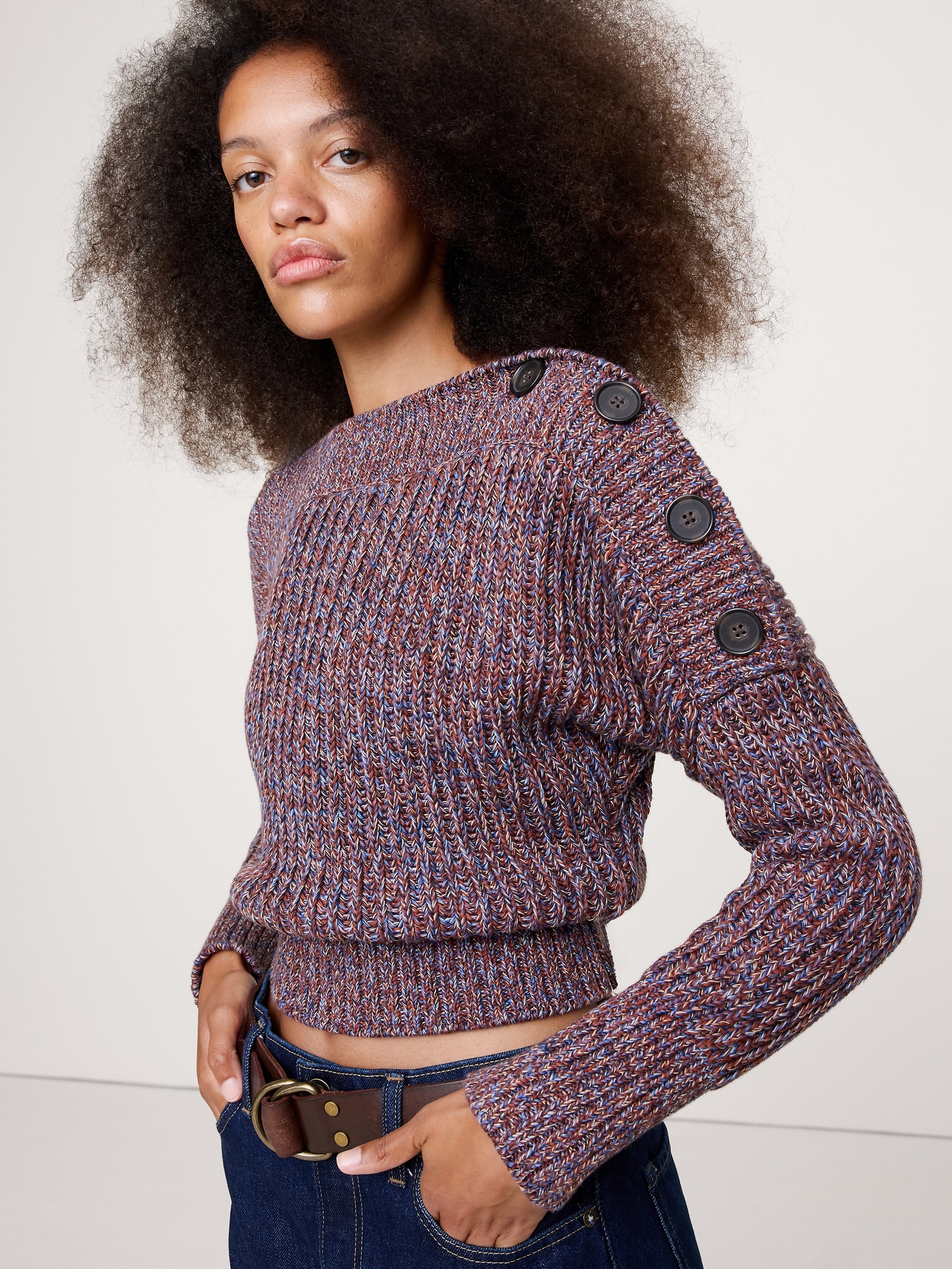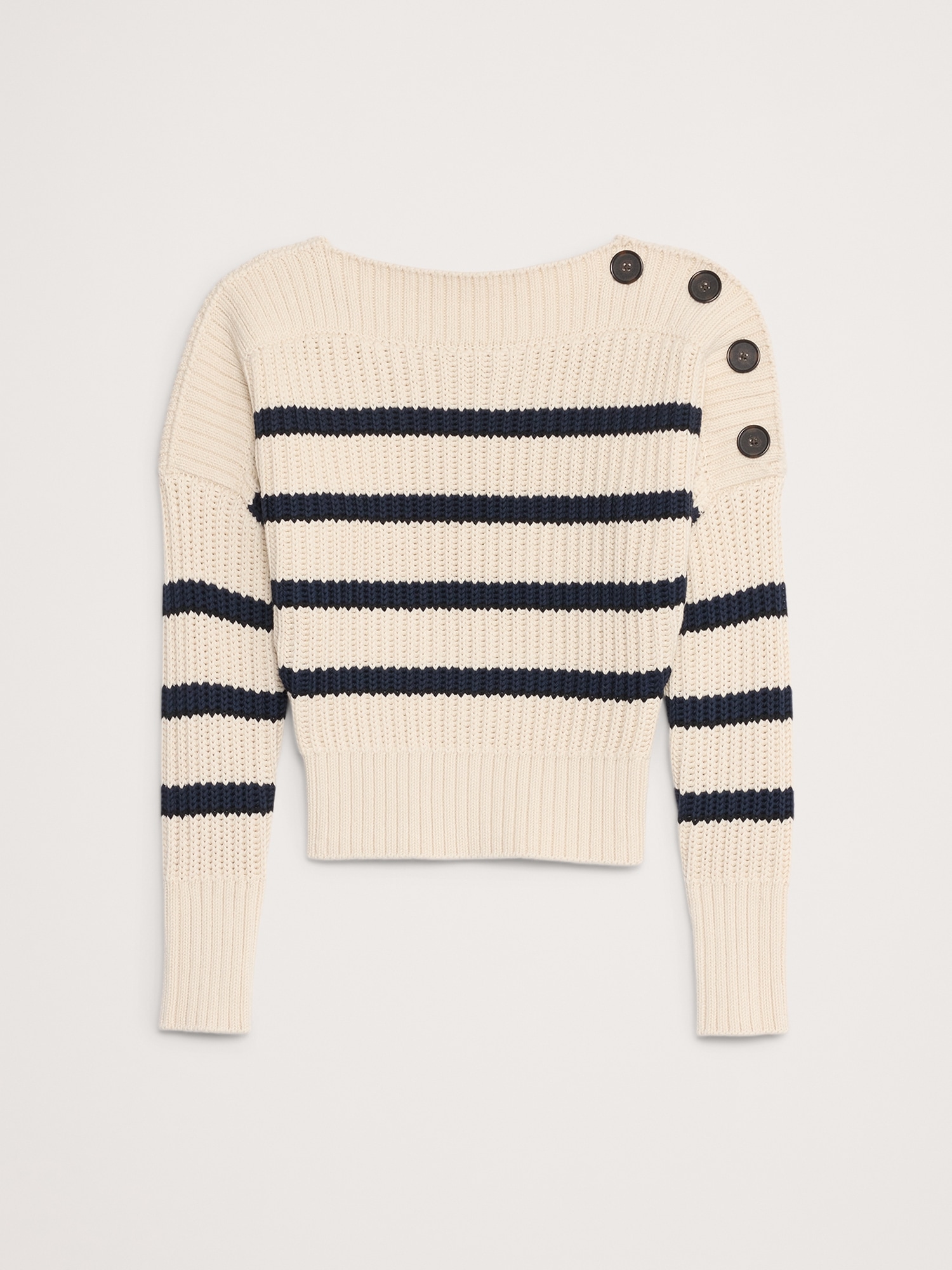 We love a boatneck sweater. Here, we borrowed the button-shoulder detail from a vintage sweater, and recreated it in one of our favorite organic cotton yarns—one we love for its softness and all-season weight.