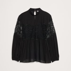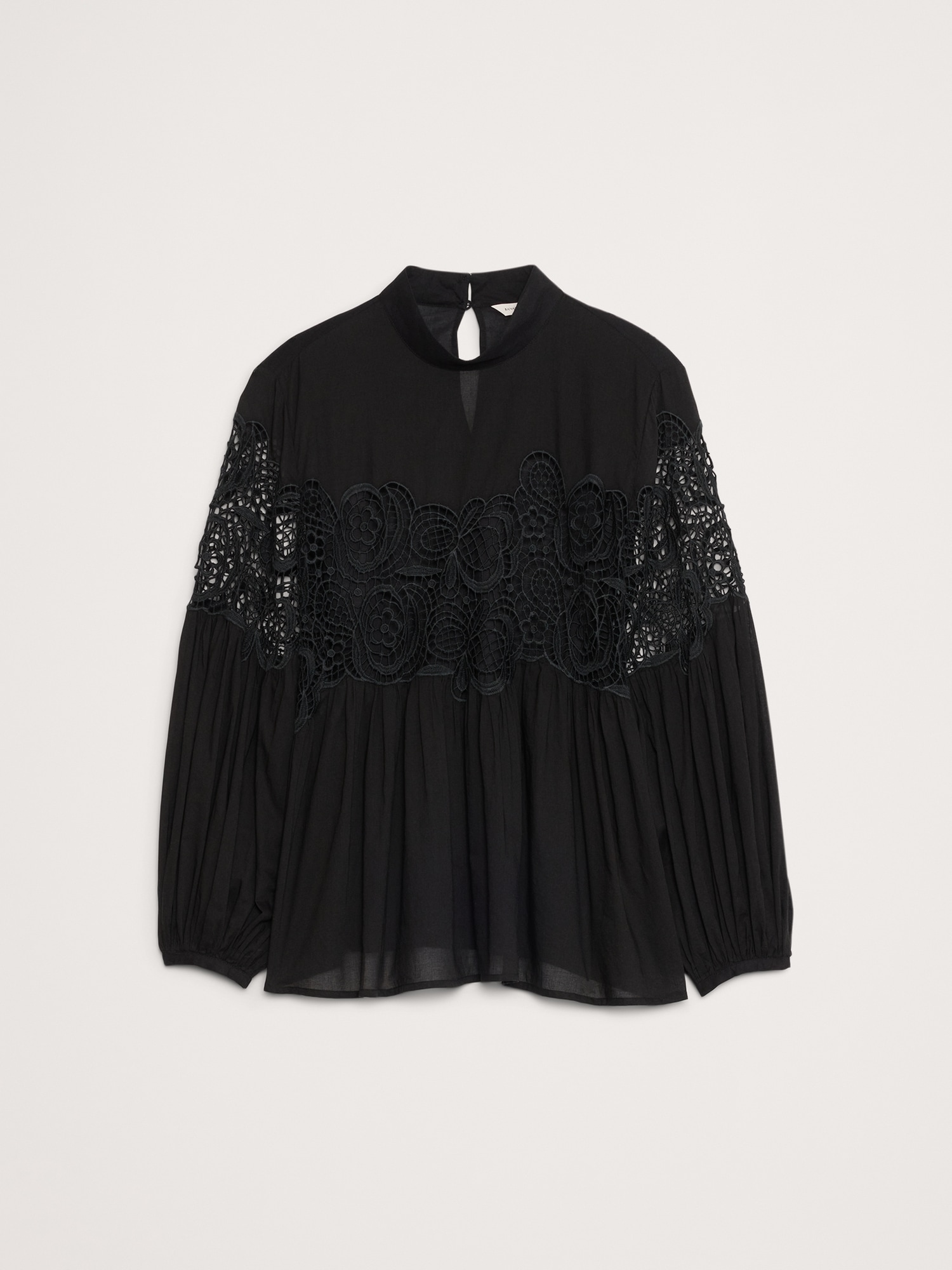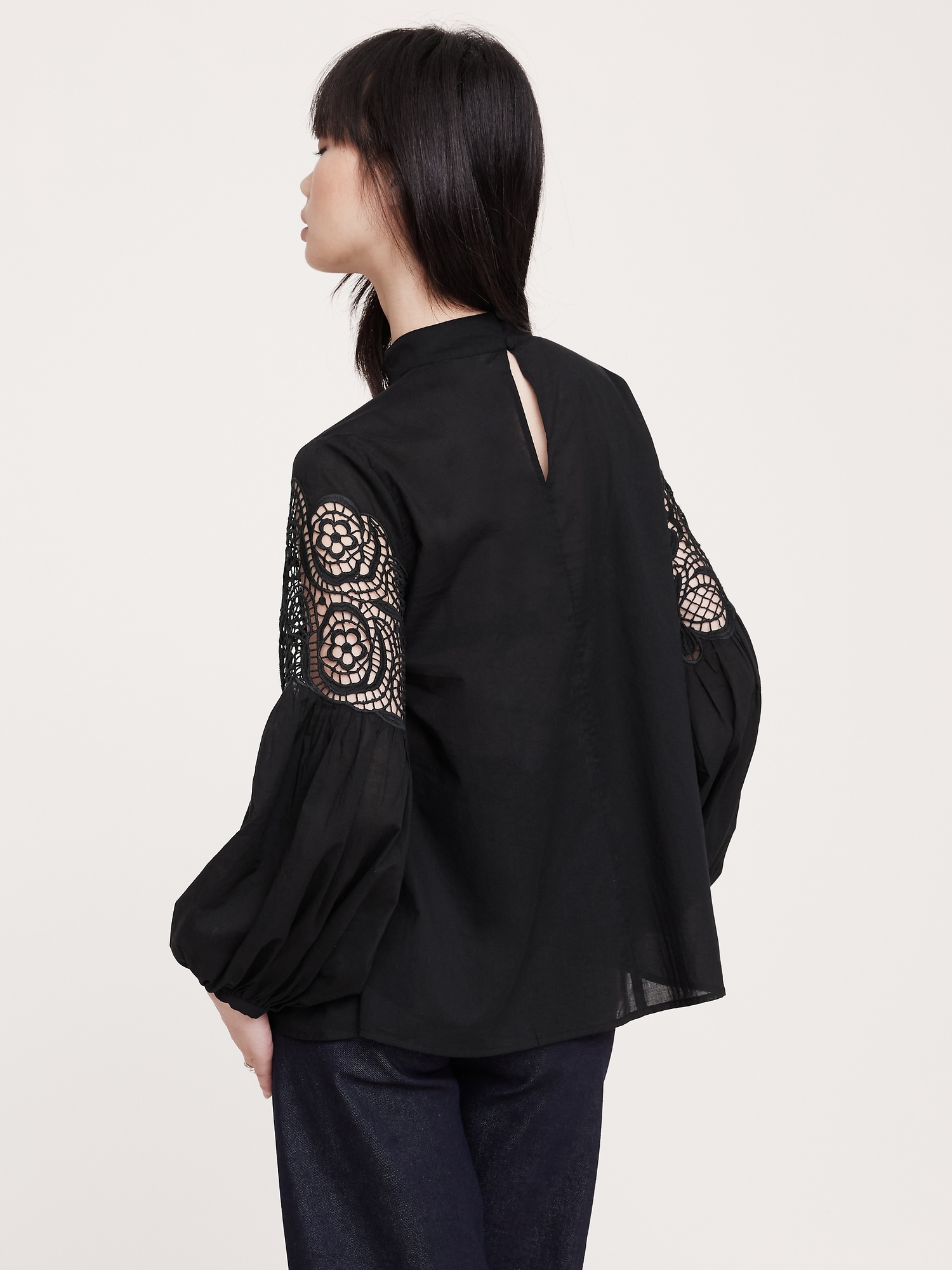In your romantic era. This billowing top is cut from cotton lawn (so it’s lighter than poplin), with embroidered, cutwork lace accents.