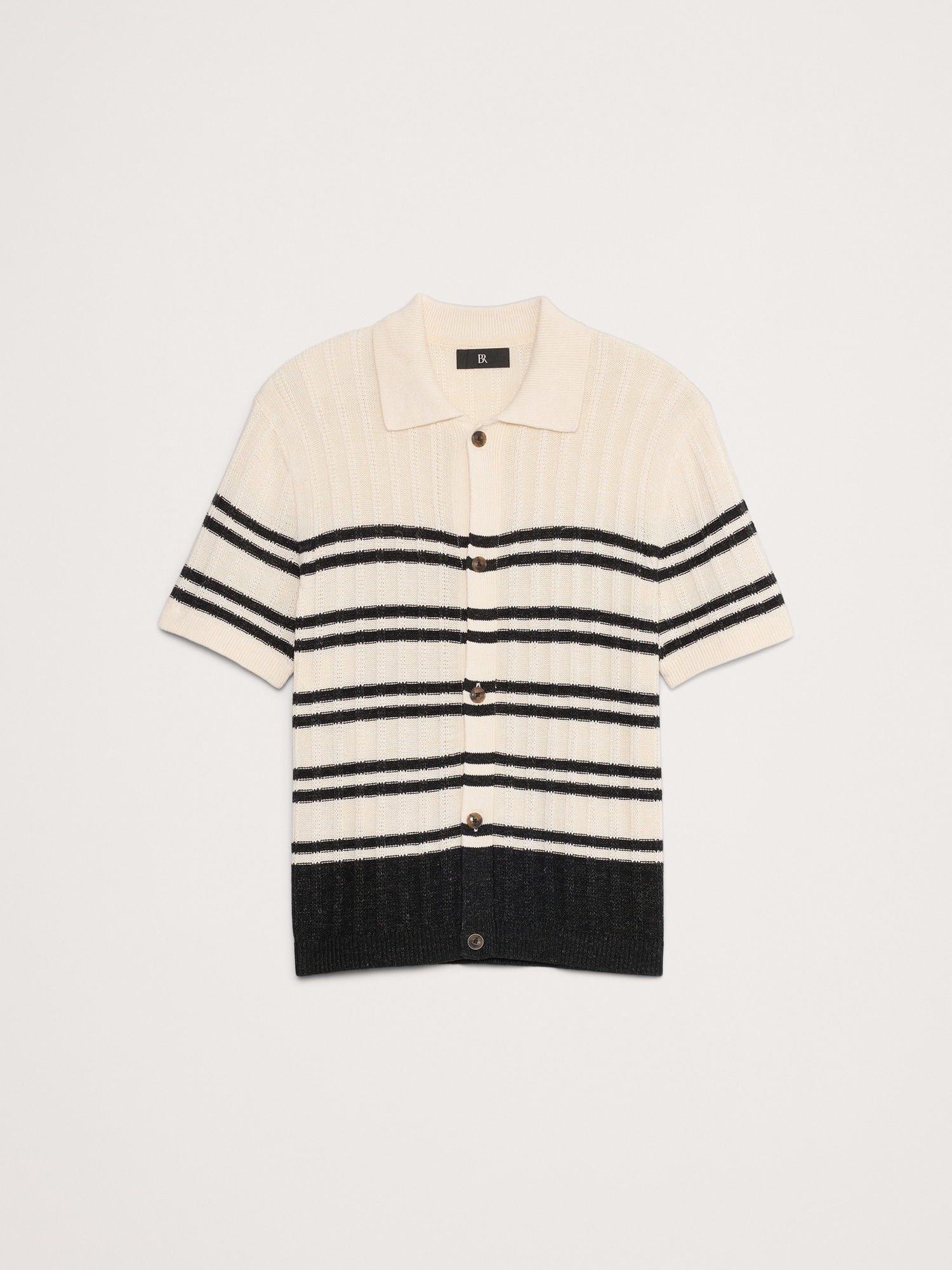 A cross between a resort shirt and a sweater polo, we used a ribbed knit stitch and our favorite cotton-linen yarn to keep this feeling warm-weather ready.