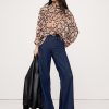 A fun and flirty take on the classic poplin shirt, this one has blouson sleeves here, as well as pleats at the waist and a cinched detail at back. Relaxed fit through shoulders, arms, and chest. Fitted waist and peplum hem. V-neck with button front. Cinched detail at back waist. Unlined. #833064