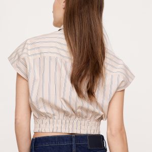 An invitation to play with proportions. This reimagined collared shirt has elastic at the hem and a tapered fit through the body that creates a sharp-shouldered silhouette.