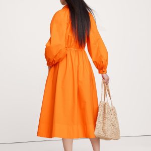 We’re loving cotton poplin right now (and always). This dress nods at the season’s volume-sleeve trend, fitted with shirtdress styling and a utilitarian drawstring at the waist.