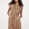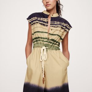 We’re loving cotton poplin right now (and always). This romper nods at the season’s utility trend with a rope-like drawstring at the waist and banded collar.
