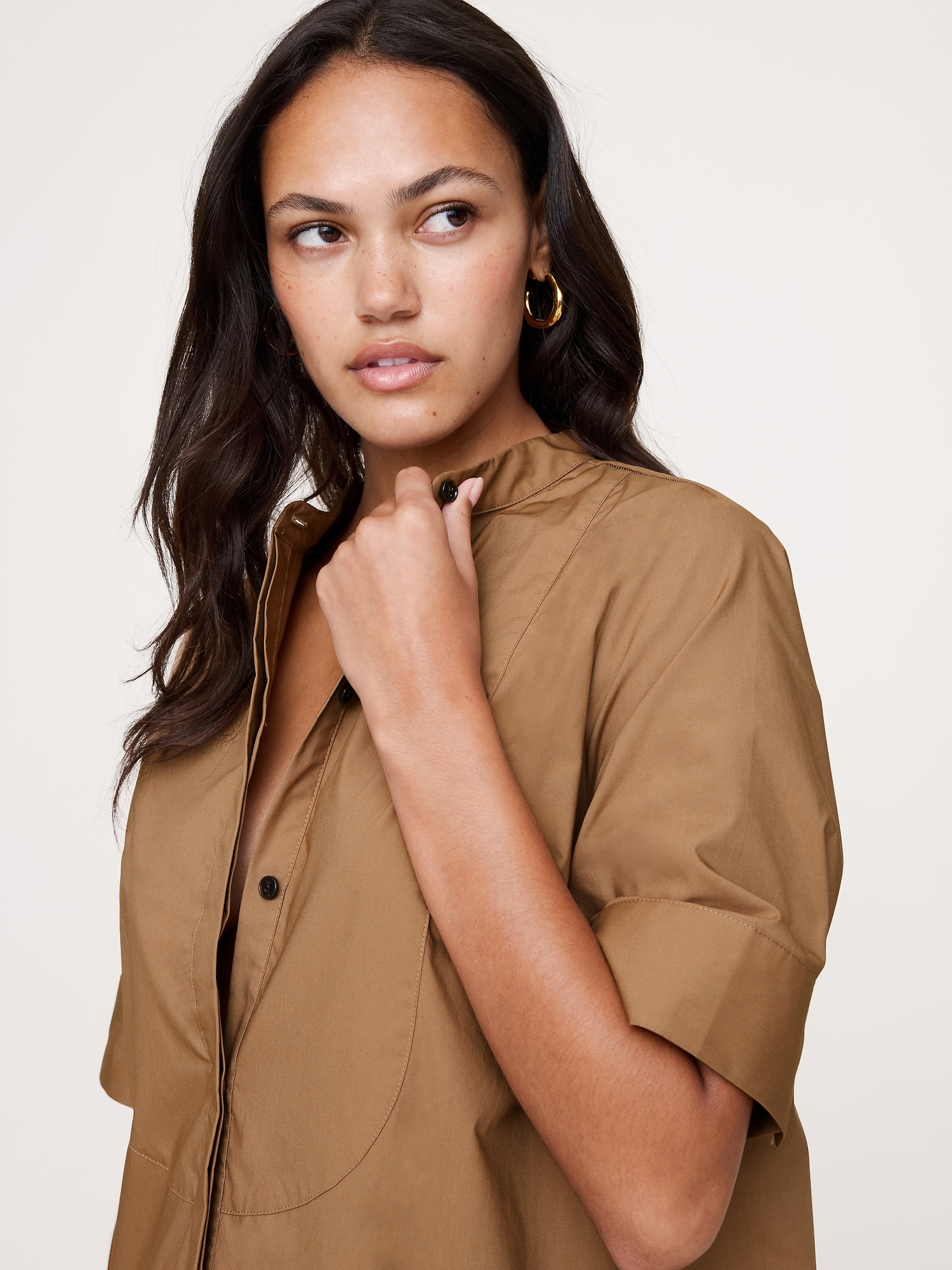 Stand collar with concealed button front.