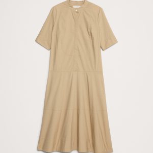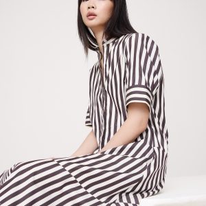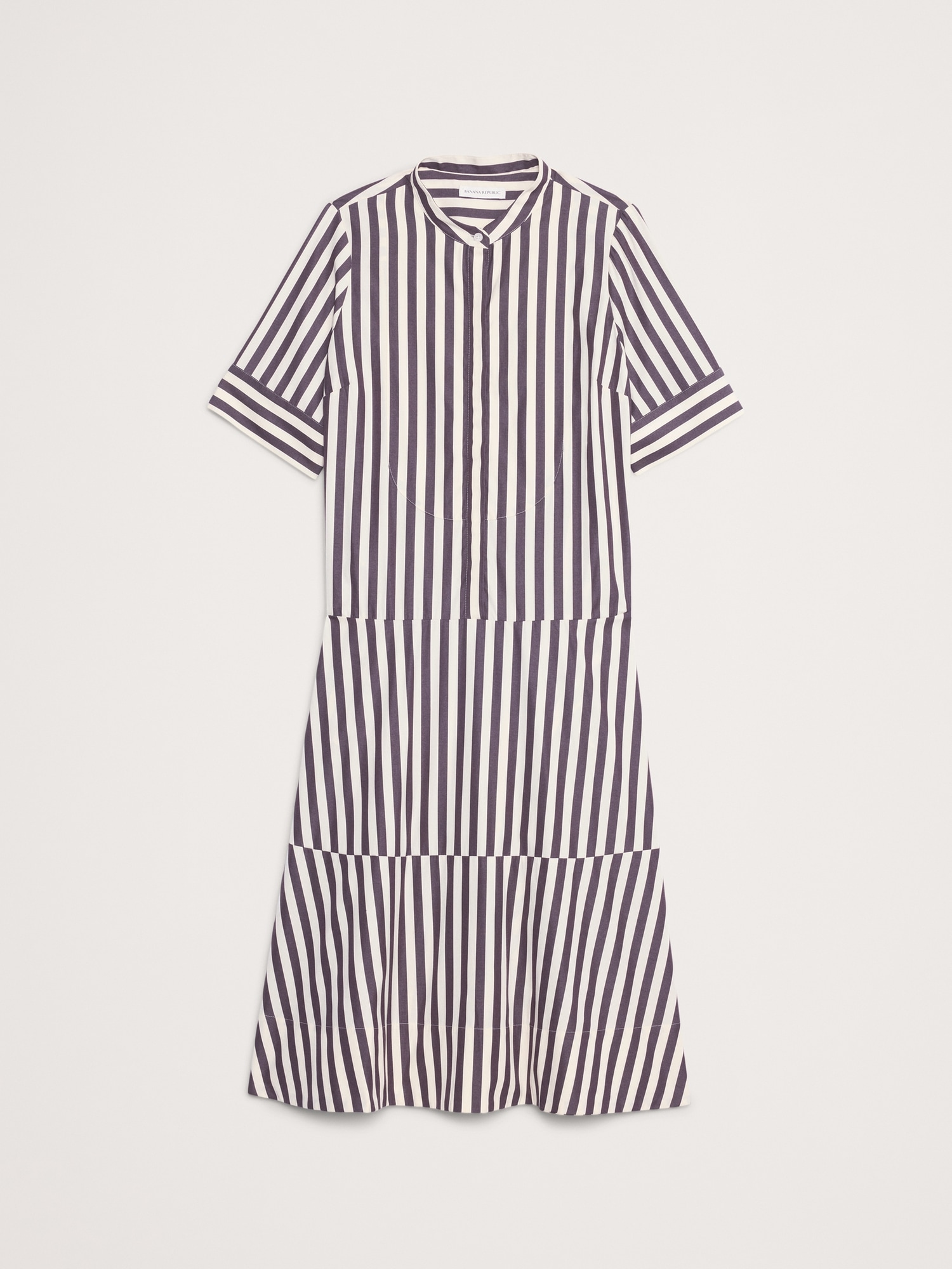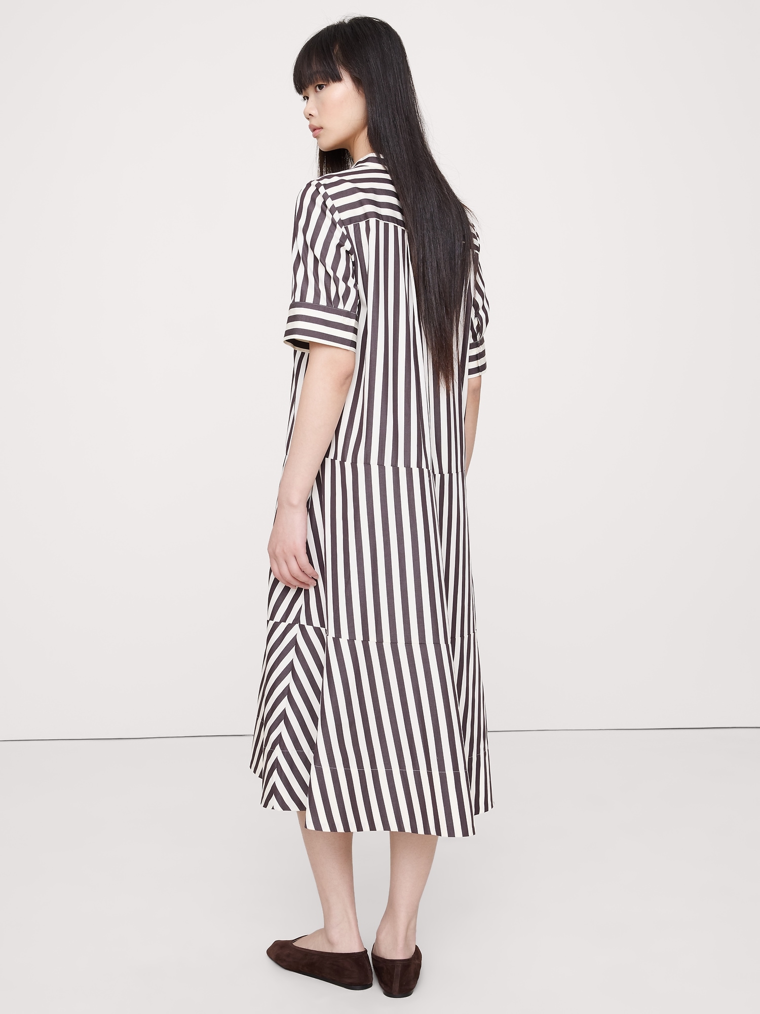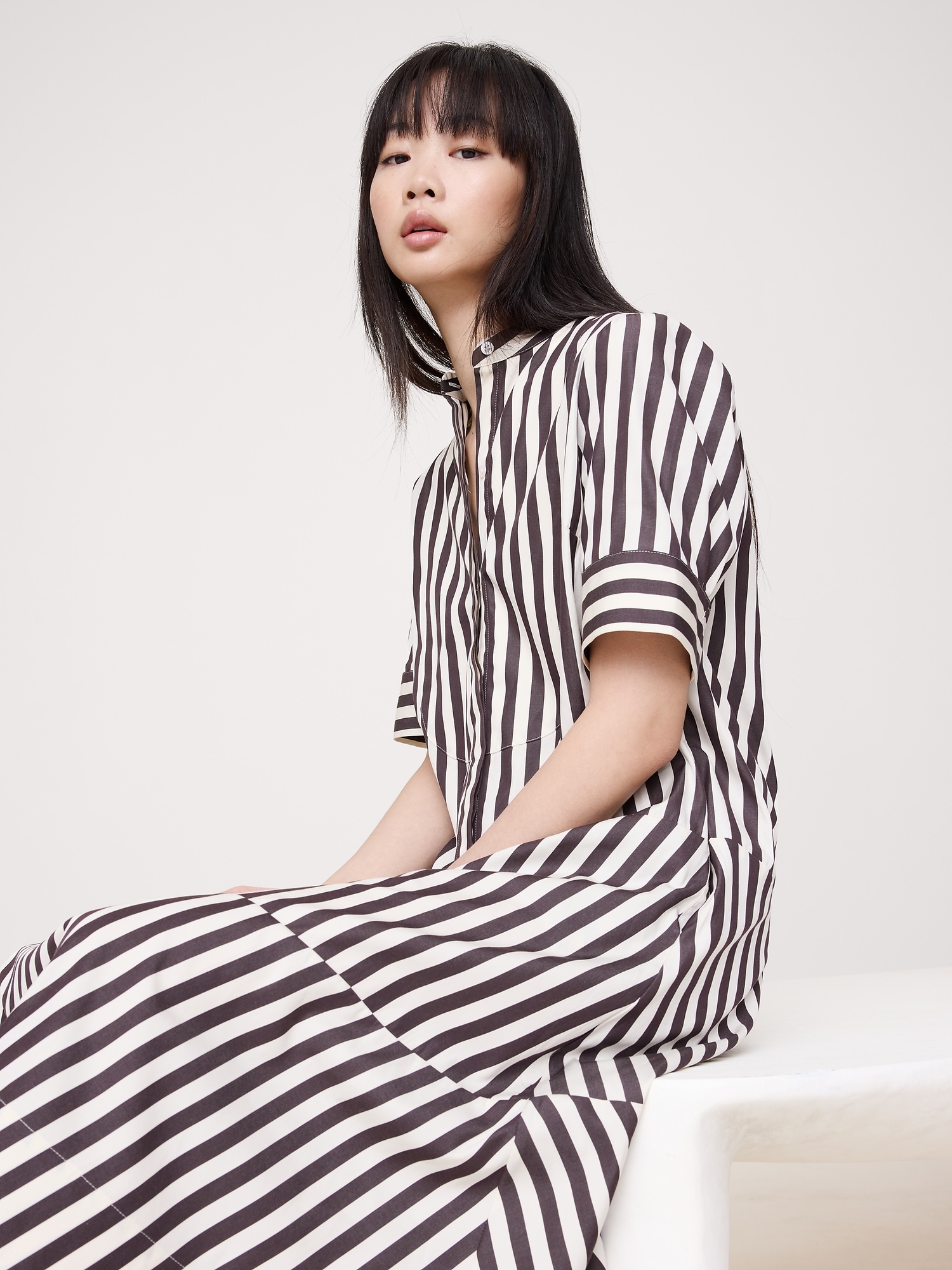 Bring on the sunshine. This is a relaxed shirt dress with a tuxedo-style front panel detail at the bodice, a tiered skirt, and an extra wide hem to add a little flounce.