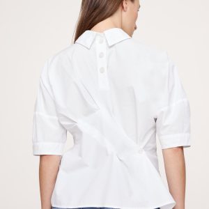 Deconstructed, reconstructed. This cotton poplin top nods at the season’s twisted shirting trend with rear button placket and pleats that wrap around the waist.