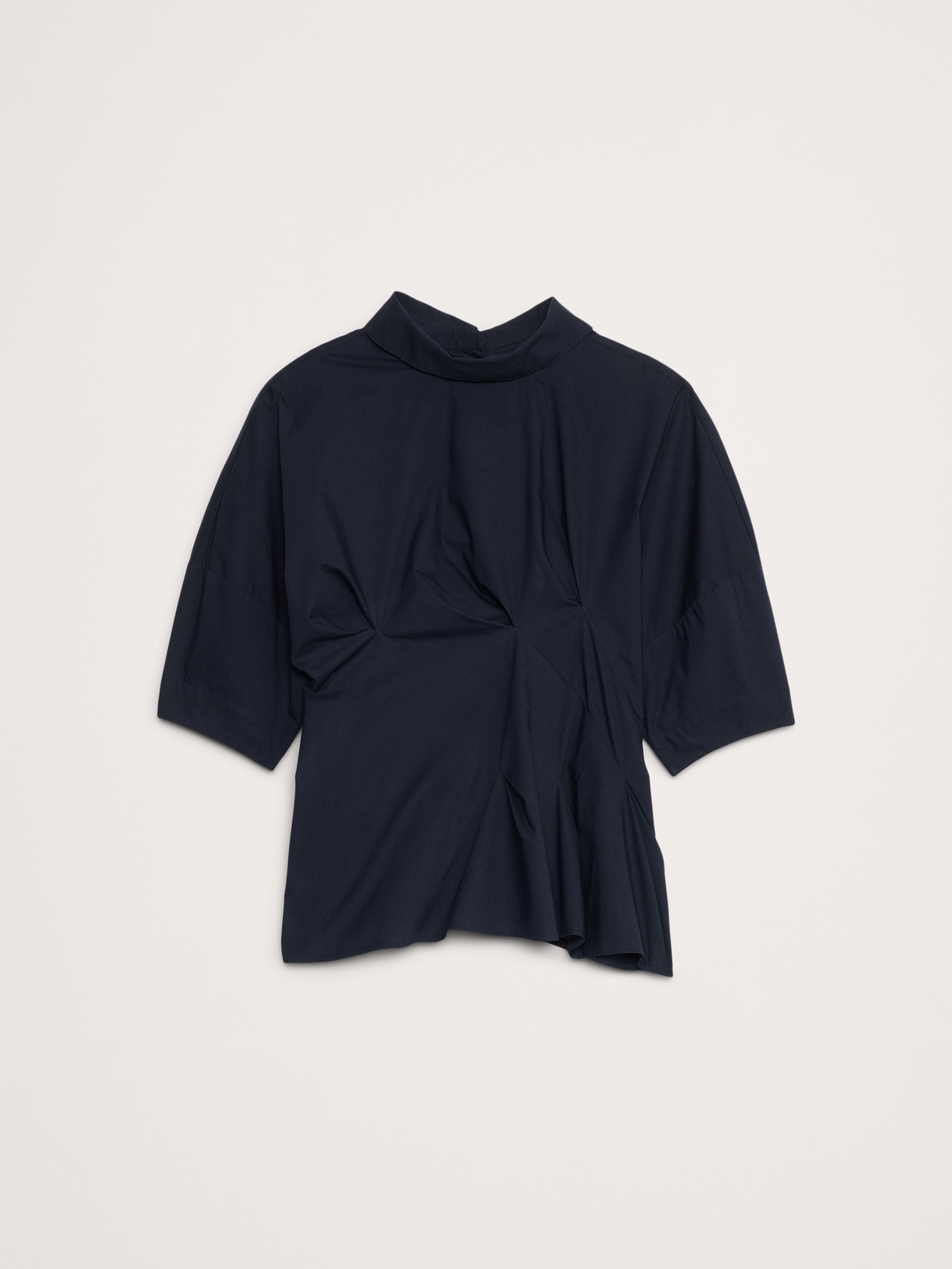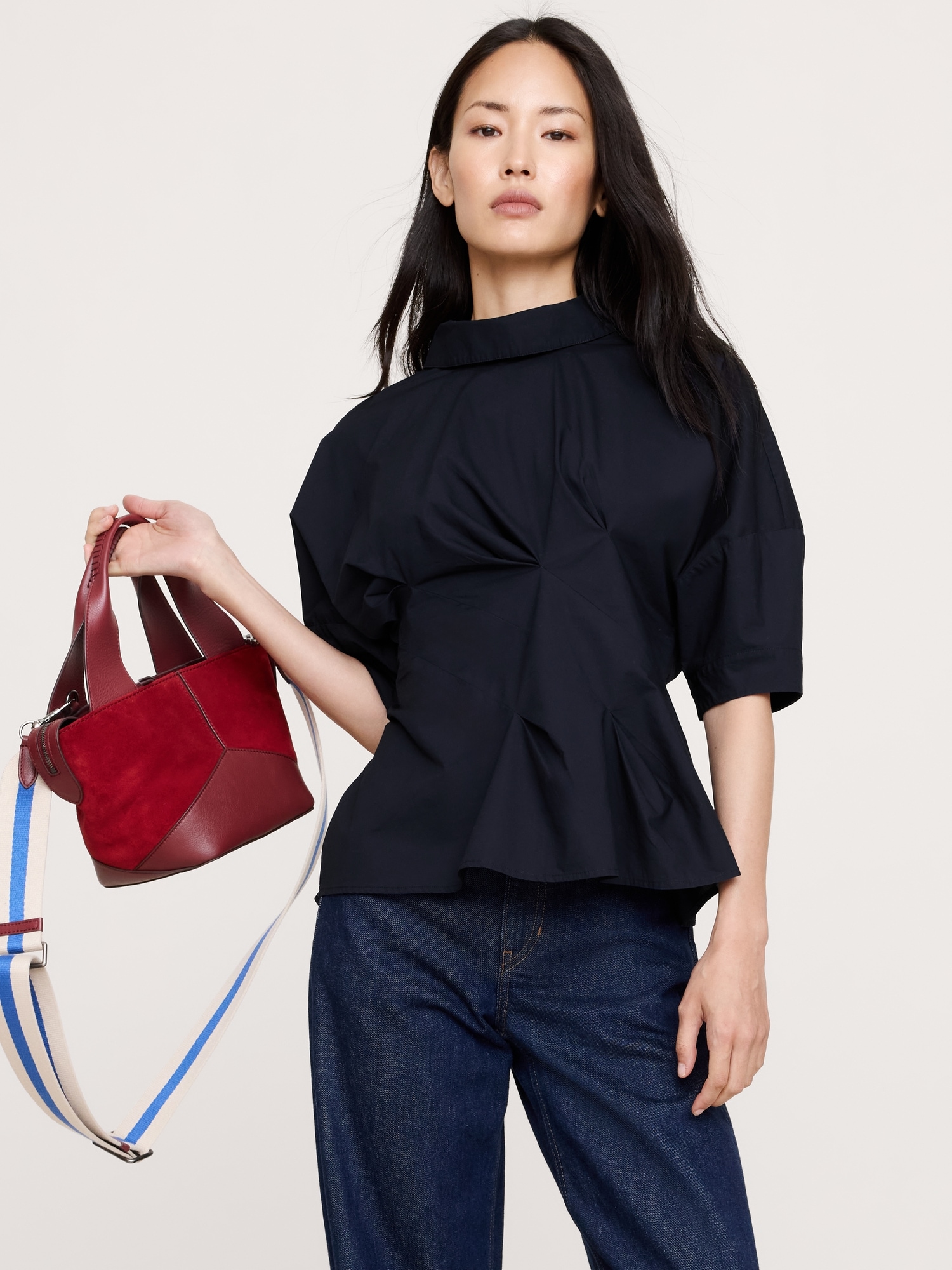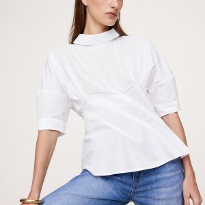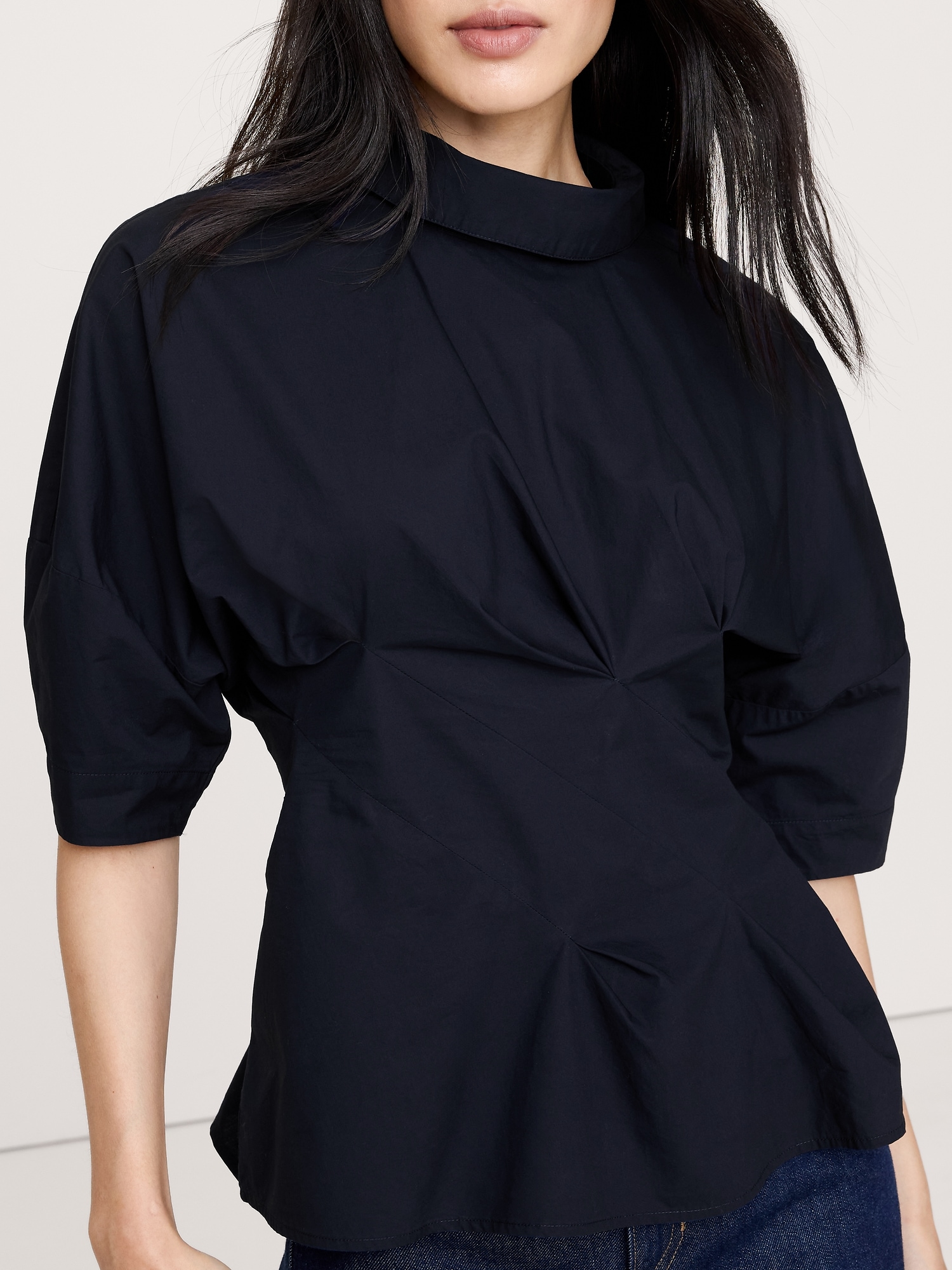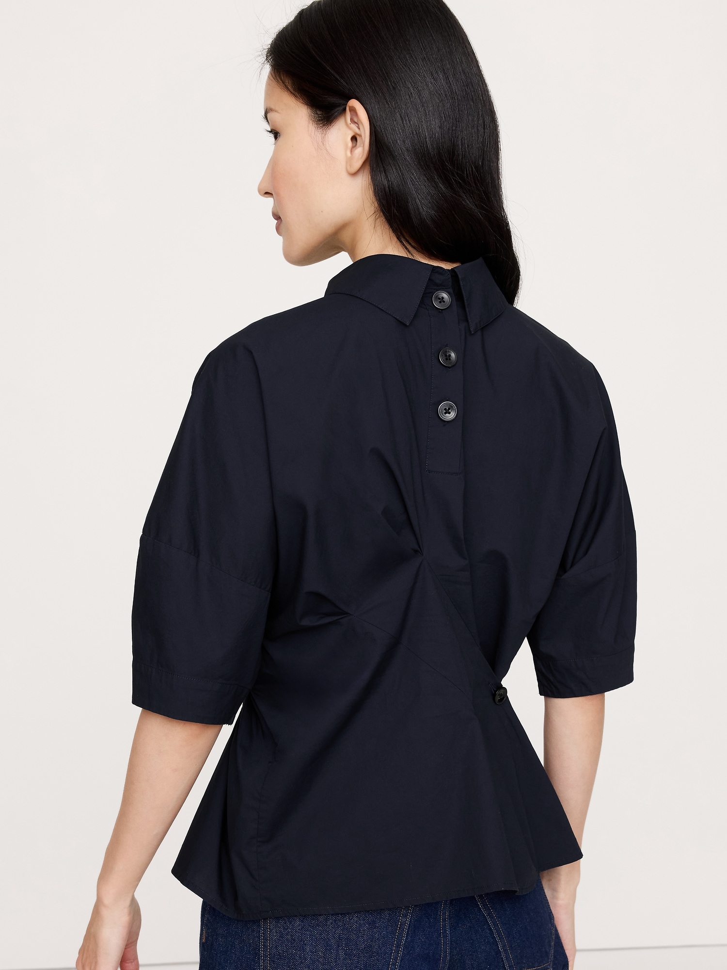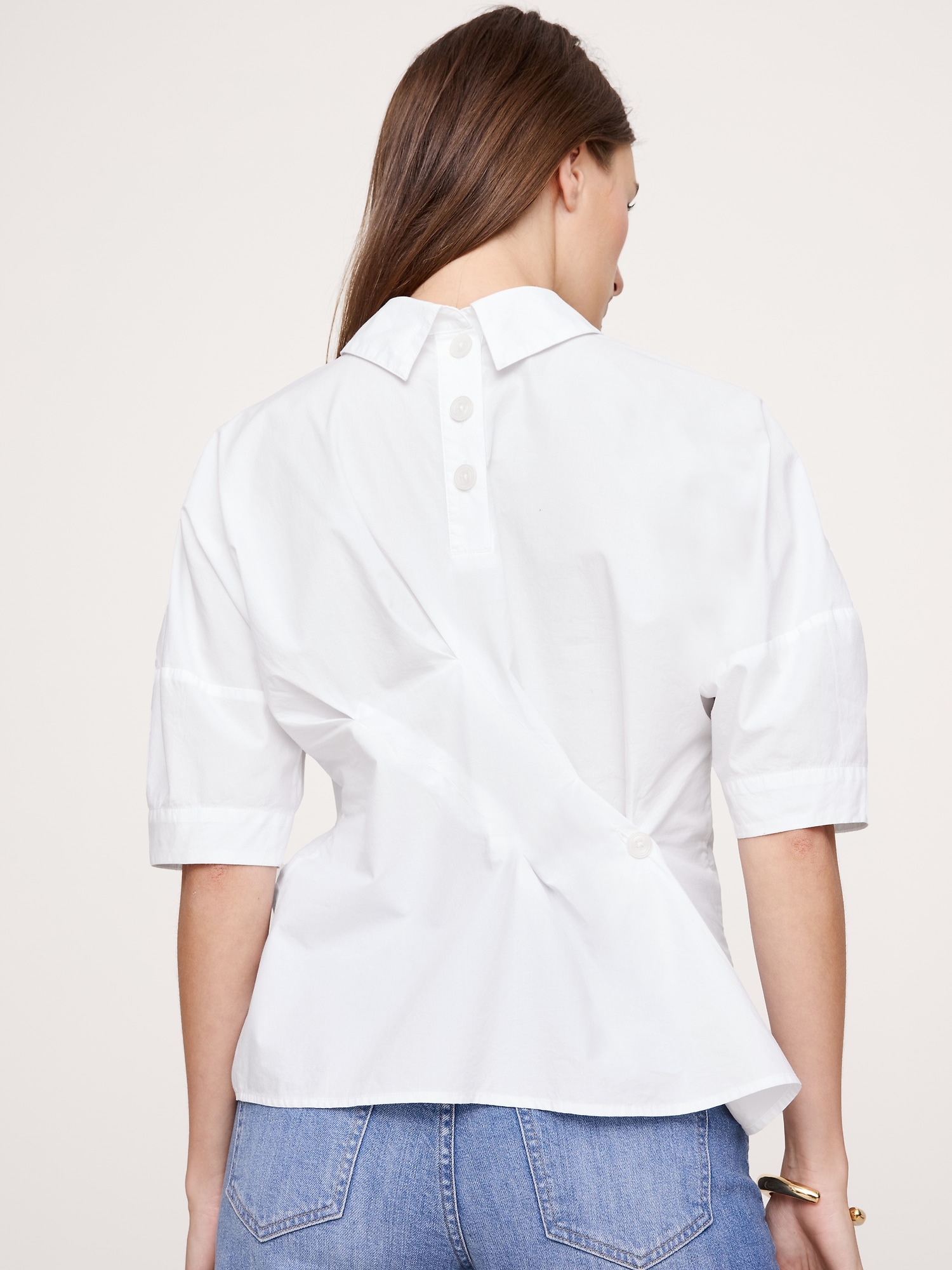 Deconstructed, reconstructed. This cotton poplin top nods at the season’s twisted shirting trend with rear button placket and pleats that wrap around the waist.