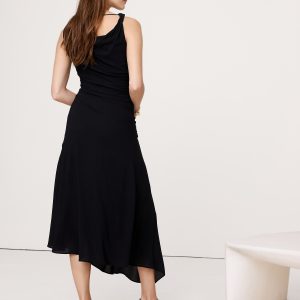 An architectural take on the 90s slip-dress, cut from a viscose crepe that feels light-as-chiffon with a subtle stretch. A twisted shoulder detail, ruching at the side, and bias-cut panels enhance its fit-and-flare silhouette.