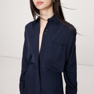 We love a shirt dress because you can wear them basically everywhere. Here, we kept the fit easy through the shoulders and chest, but defined the waist. Cut in our drapey twill so it’s a bit more dressed up.