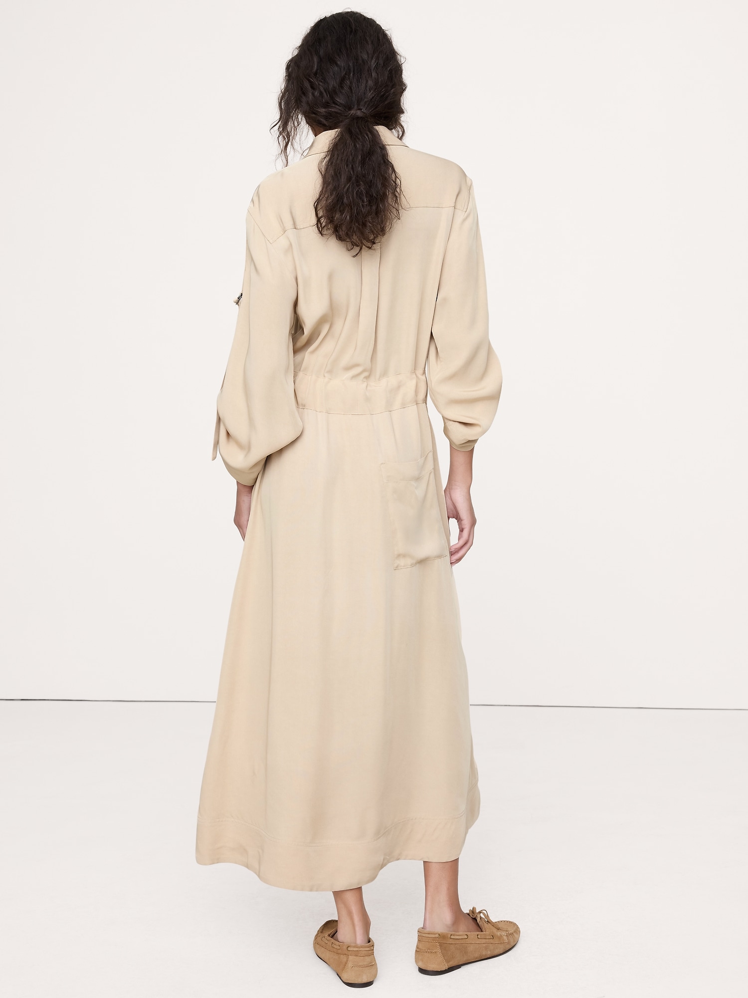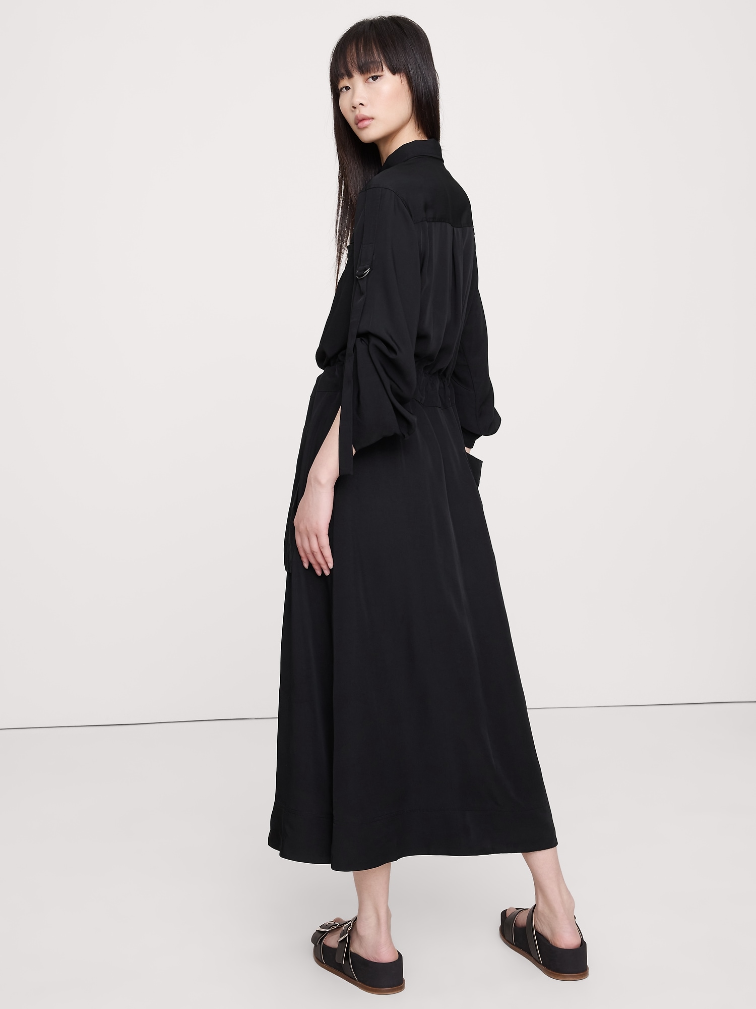 Always put-together, we love a shirt dress because you can wear it basically everywhere. Here, we imagined it with utility pockets in our drapey twill so it’s a bit more dressed up.