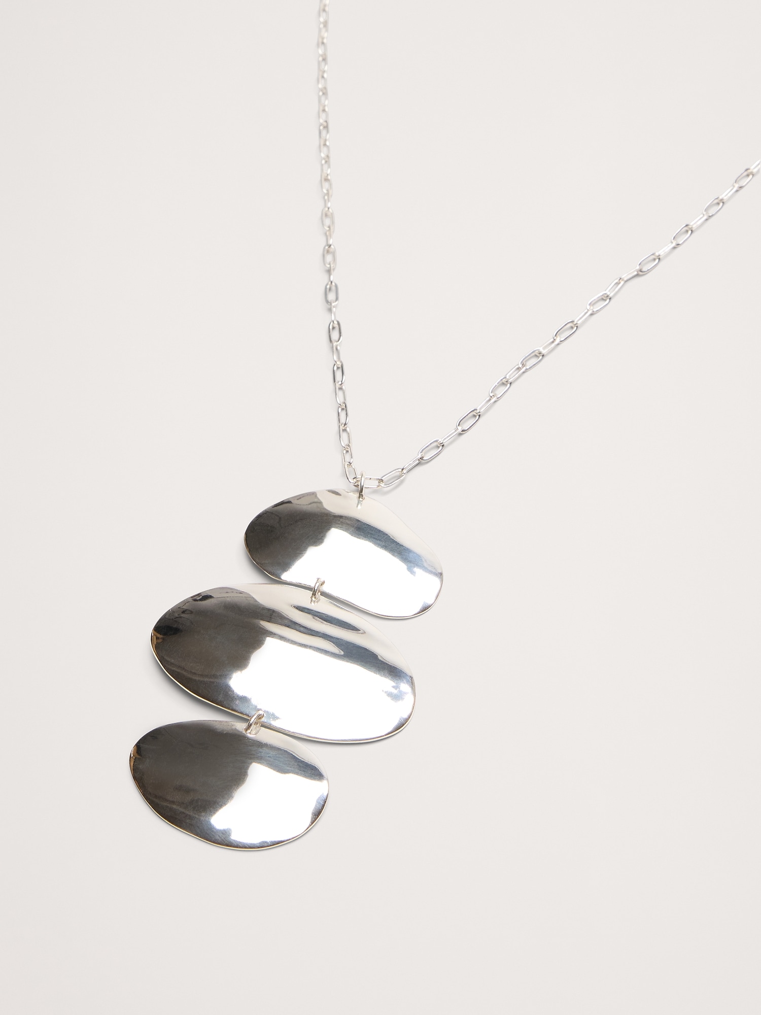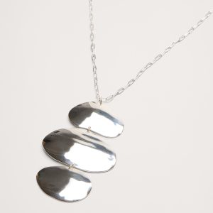 A fabulous trio of abstract ellipses with gently undulating texture hang from a long adjustable length chain.
