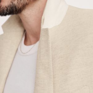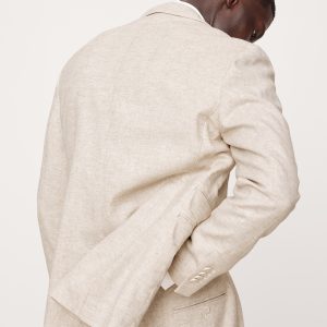 Designed with warm climates in mind, this sleek suit jacket is cut from an herringbone fabric that blends together soft cotton and luxurious linen. Here, we left the jacket unlined through the back for even better breathability.