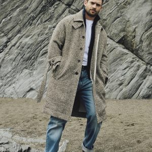 Modeled after the traditional Balmacaan coat, this piece is cut from an Italian, wool-blend fabric woven in a herringbone pattern with a beautiful tweed-like finish.