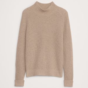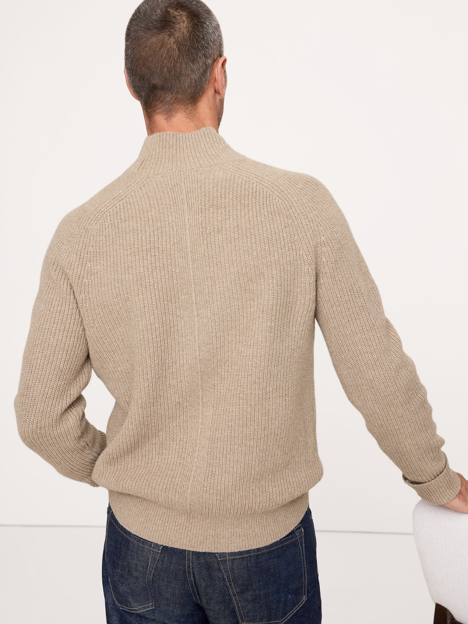 We cut this cozy sweater with a mock-neck for extra warmth in cold weather, opting for a ribbed knit stitch in one of our warmest and softest Merino wool blends from Italy.