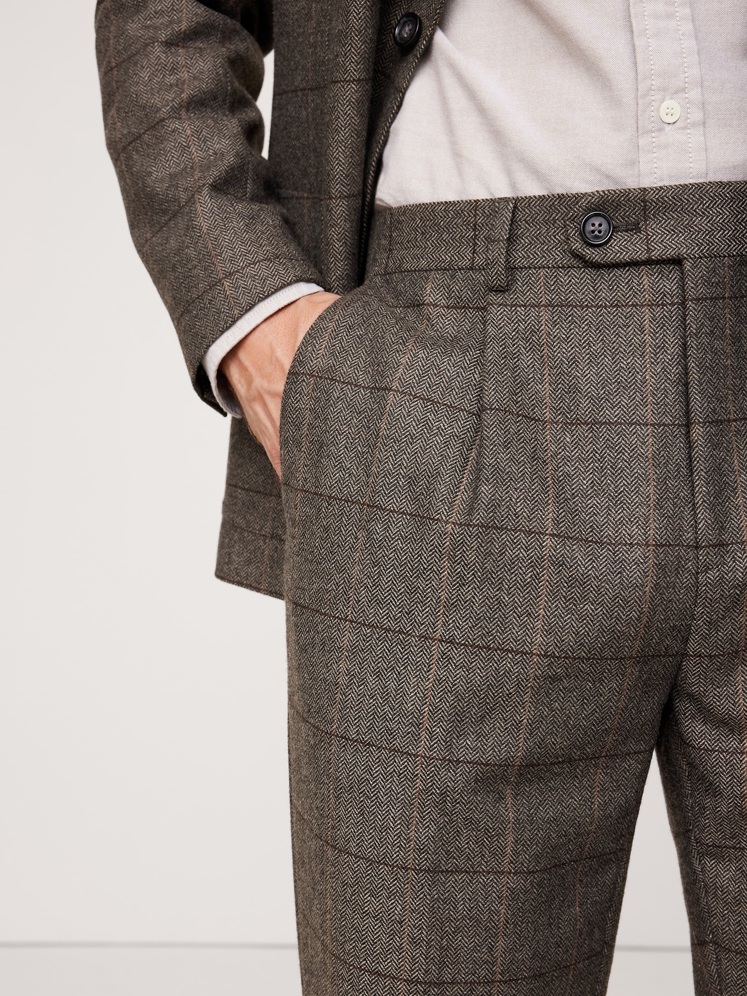 A suit to carry you through fall and beyond, we reached for a textured wool-blend from our friends at Italy’s Alfa-Fi mill (we love its herringbone weave and windowpane plaid).