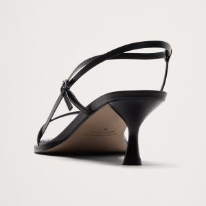 Set atop a modest kitten heel, these sleek almond-toe sandals are crafted with sleek, Italian leather or satin straps that wrap around the foot and ankle for a secure fit.
