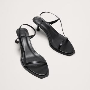 Set atop a modest kitten heel, these sleek almond-toe sandals are crafted with sleek, Italian leather or satin straps that wrap around the foot and ankle for a secure fit.