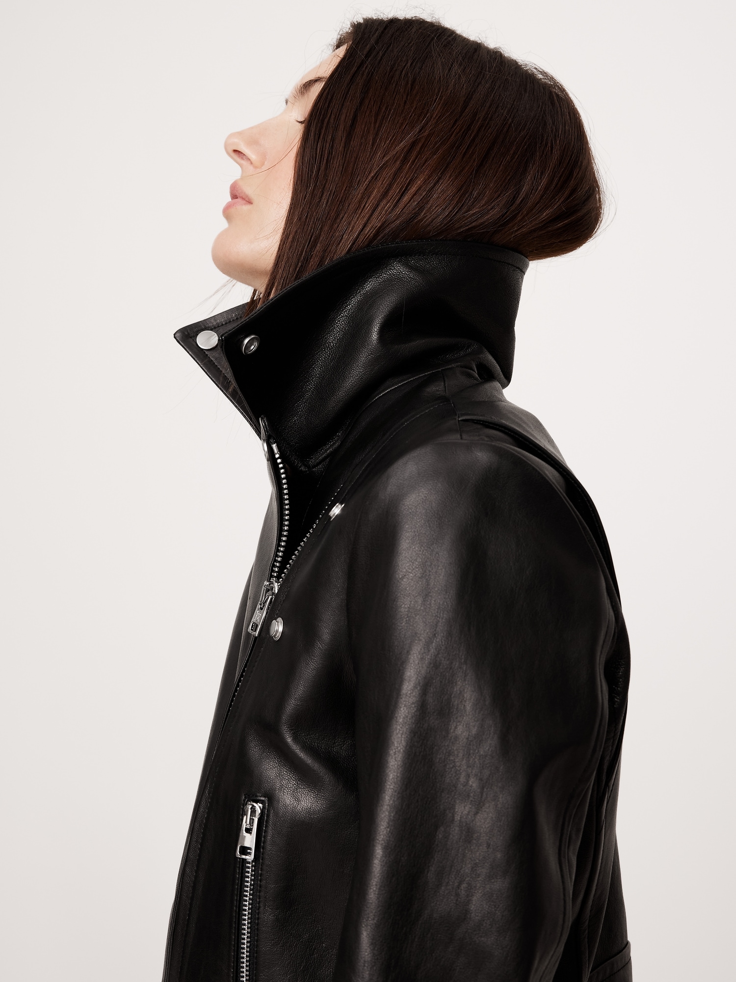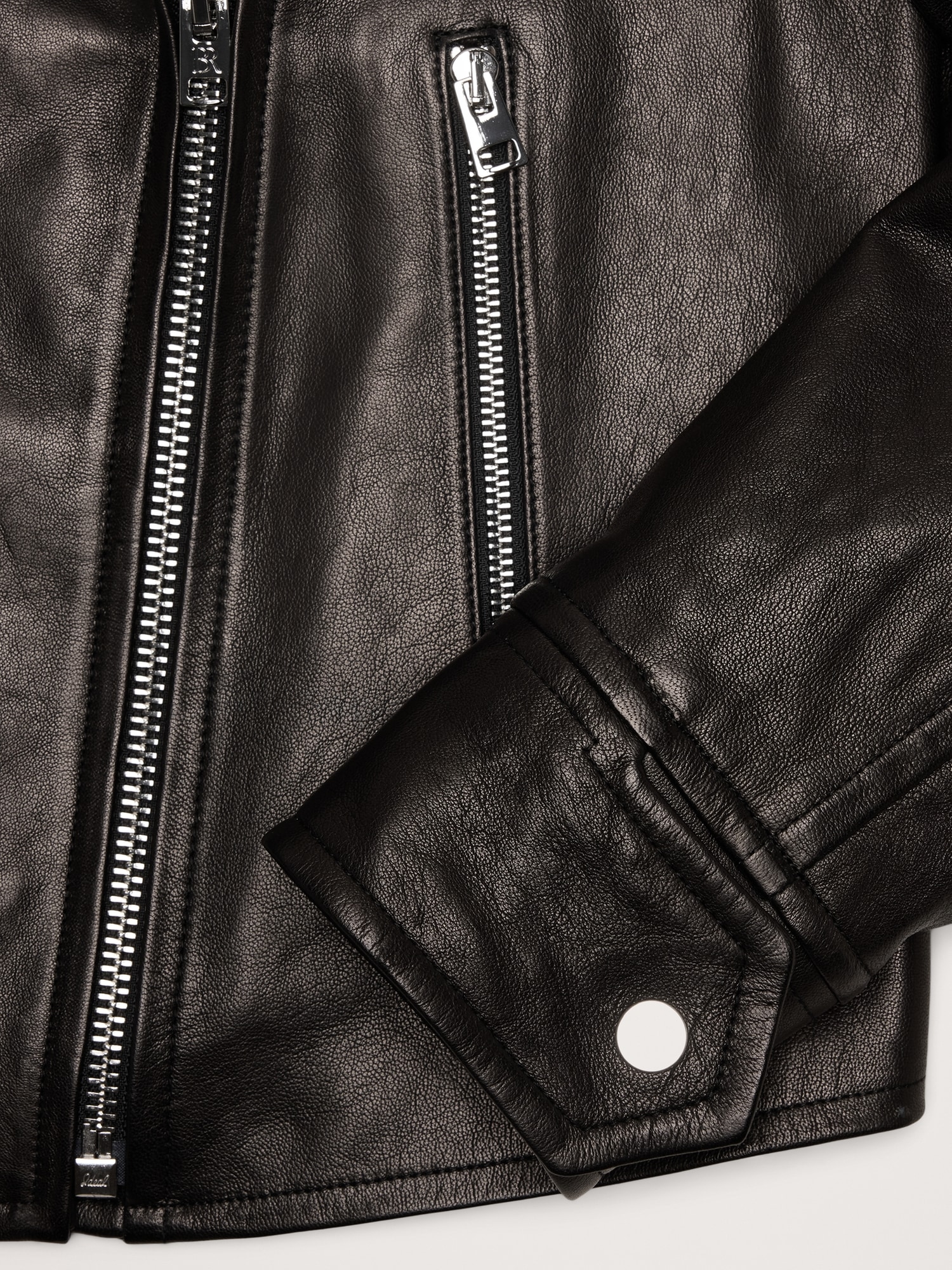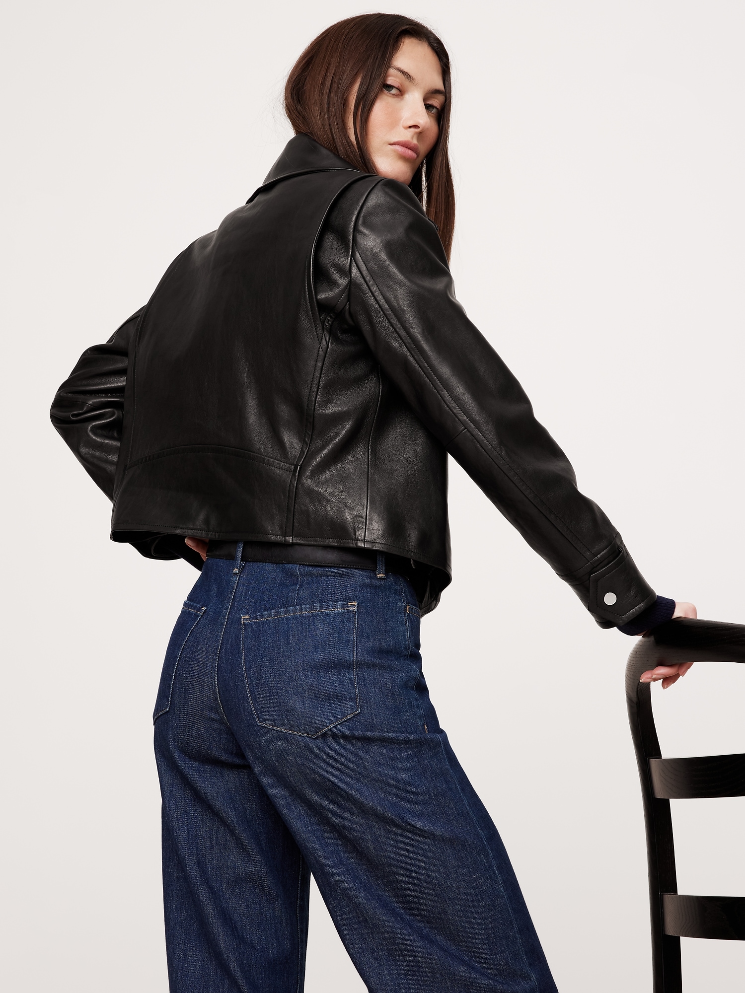 A relaxed and slightly cropped take on the moto jacket, our designers selected a specially-tanned lambskin leather here. We love the way softens with every wear, developing a unique patina with every wear.