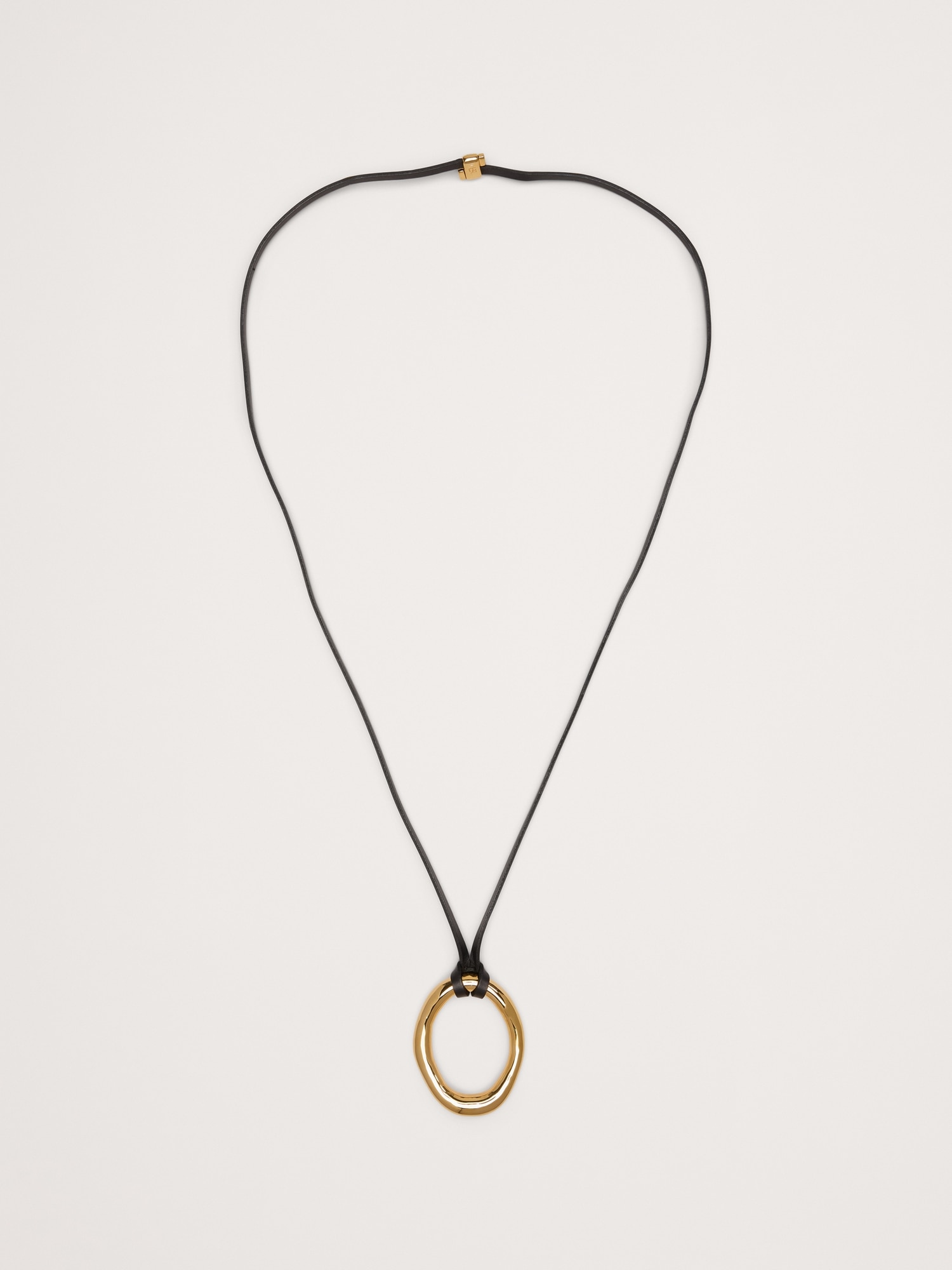 A bold exploration of contrasting textures, this necklace juxtaposes a fluid oval against luxurious leather. Part of our demi-fine jewelry collection, each piece is handcrafted from either 14k-gold or 999-silver plated brass.