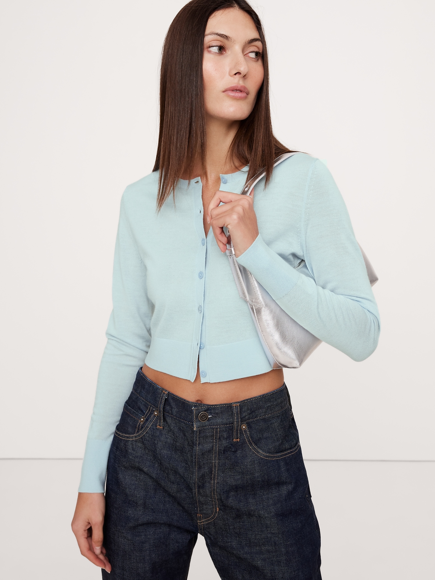 Extra-fine. This cropped cardigan sweater is fully fashioned in our lightweight 100% extra-fine Merino wool, a favorite for it’s softness and warm-weather weight.