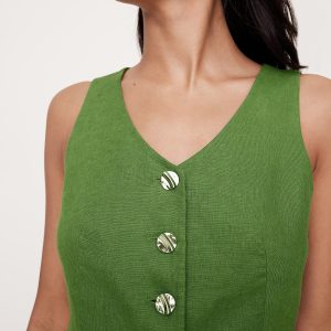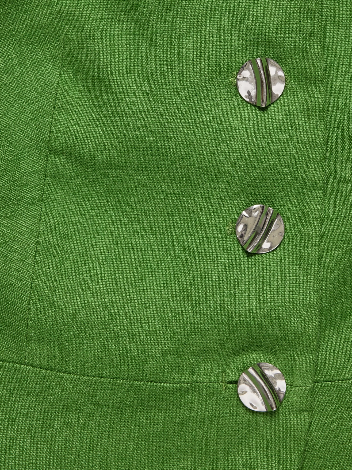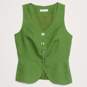 We designed this tailored vest with darts at front and back to define the waist, crafted in 100% certified-European linen with novelty buttons.