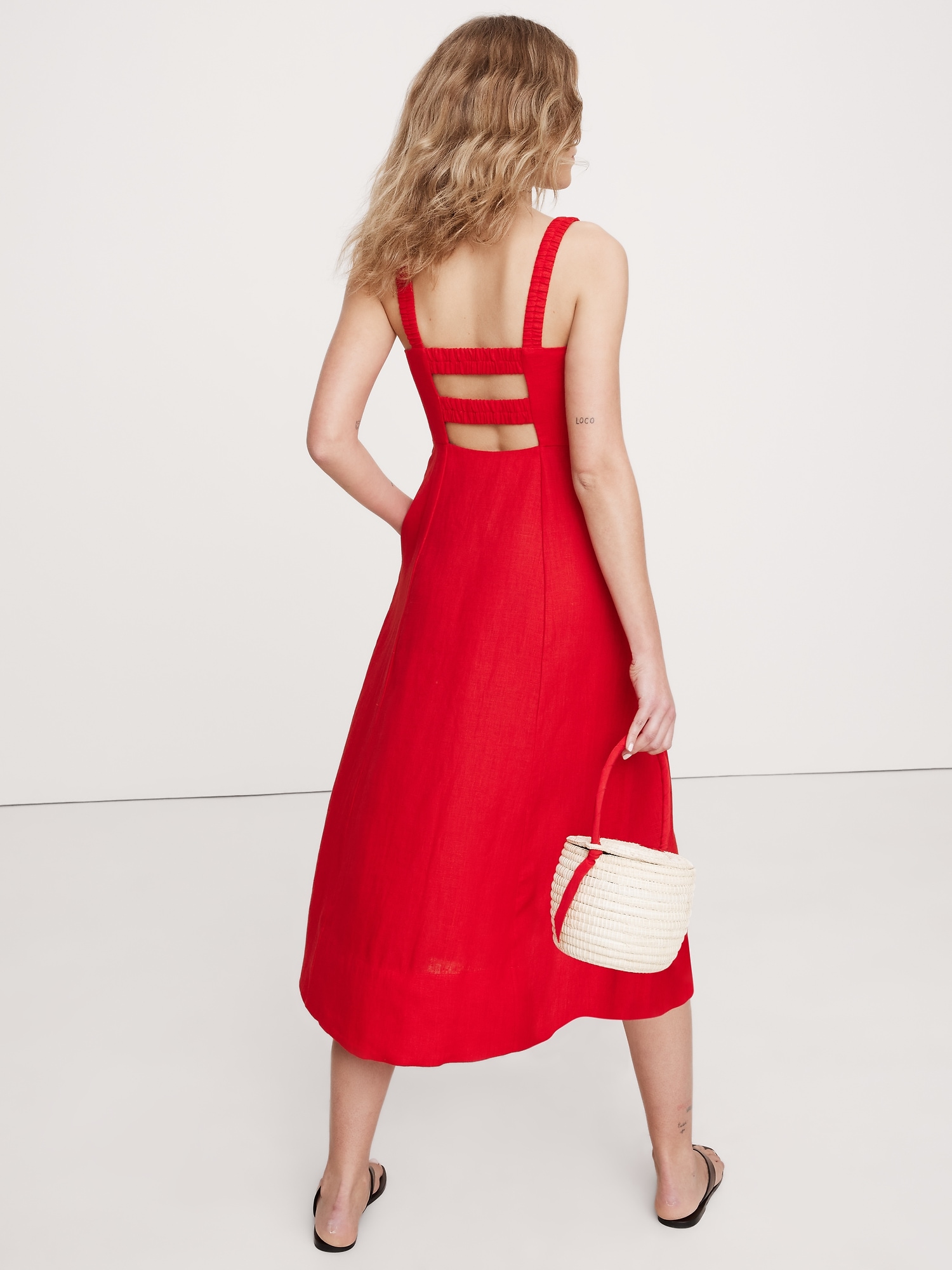Details we love about this dress: the square neckline, the cut-out detail at back, and the 100% certified-European linen fabric.