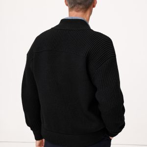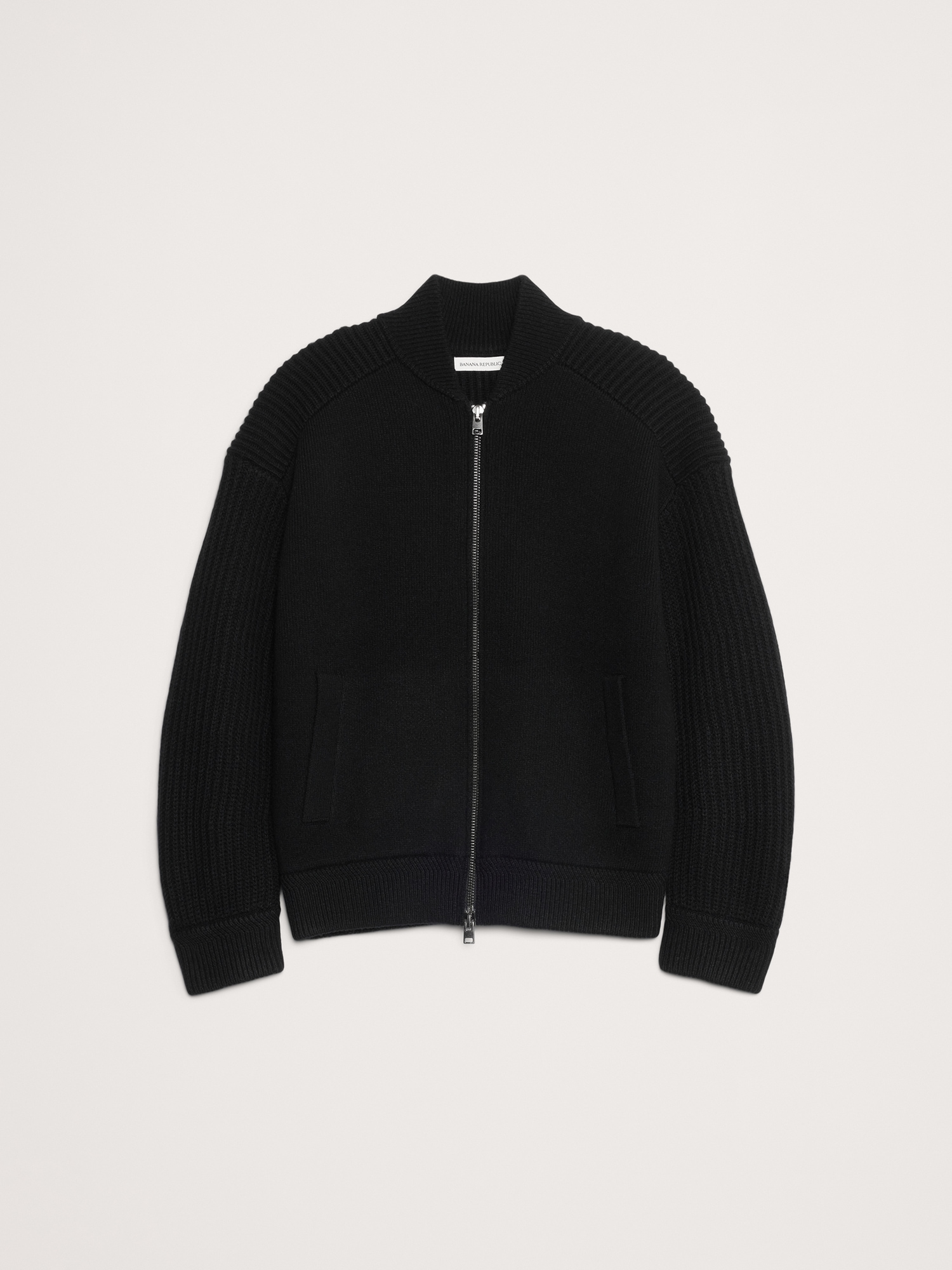 We borrowed design details from the classic bomber jacket for this zip-up sweater, selecting ribbed stitches to create panels at the shoulders and arms. Here, we selected one of our favorite Merino wool blends, which we love for its ability to add warmth without adding too much weight.