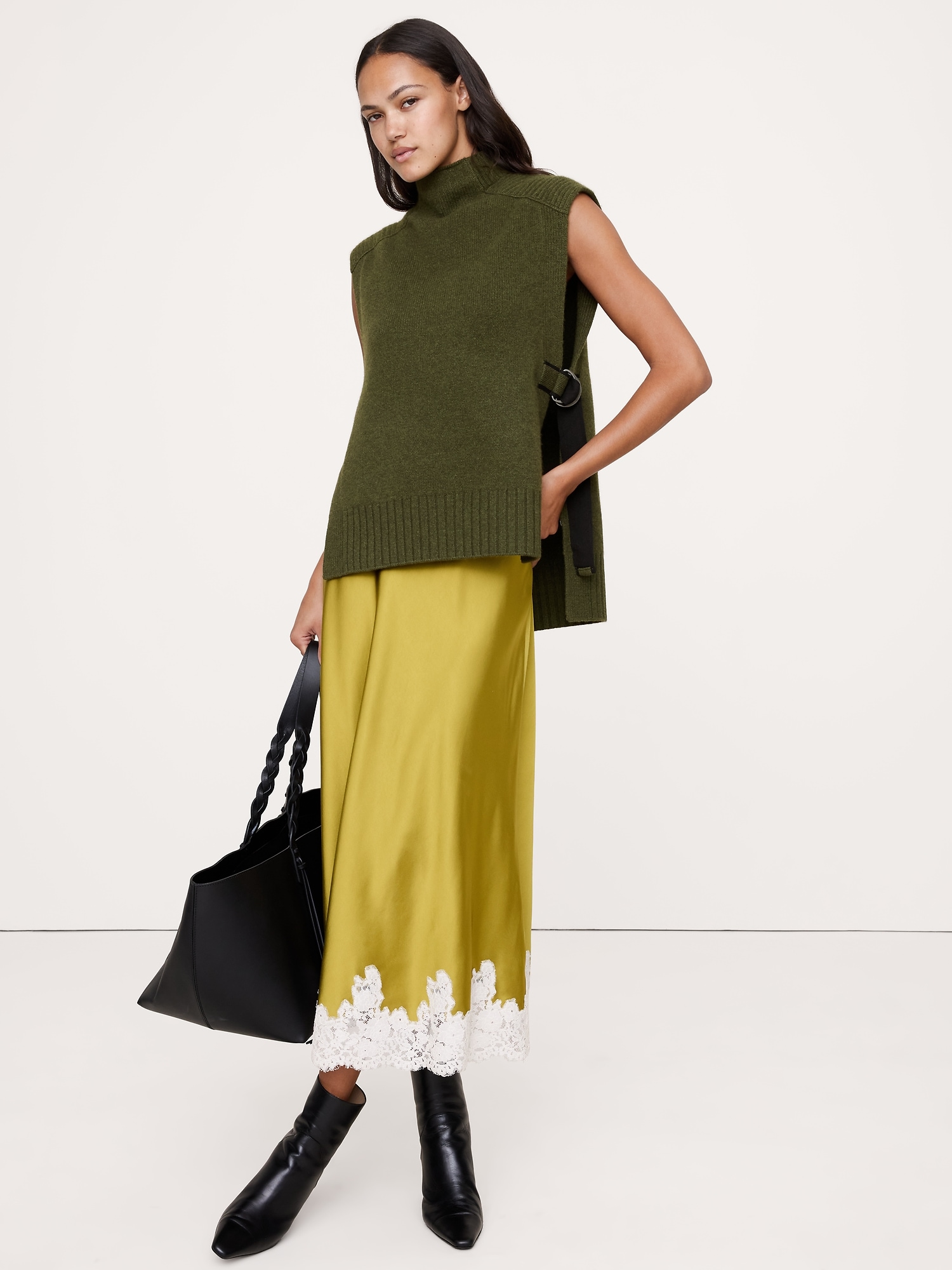 A layer to carry you through cooler seasons to come, we designed this cute sweater vest with open sides as an invitation to play with proportions Crafted in a warm and luxuriously soft blend of Merino wool and cashmere.