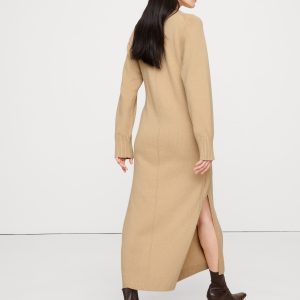 We’re dreaming of a warm sweater dress to carry us through cool weather. Enter, this maxi wrap dress, knitted in soft blend of Merino wool and certified-organic cotton, with a tie waist and side slit.