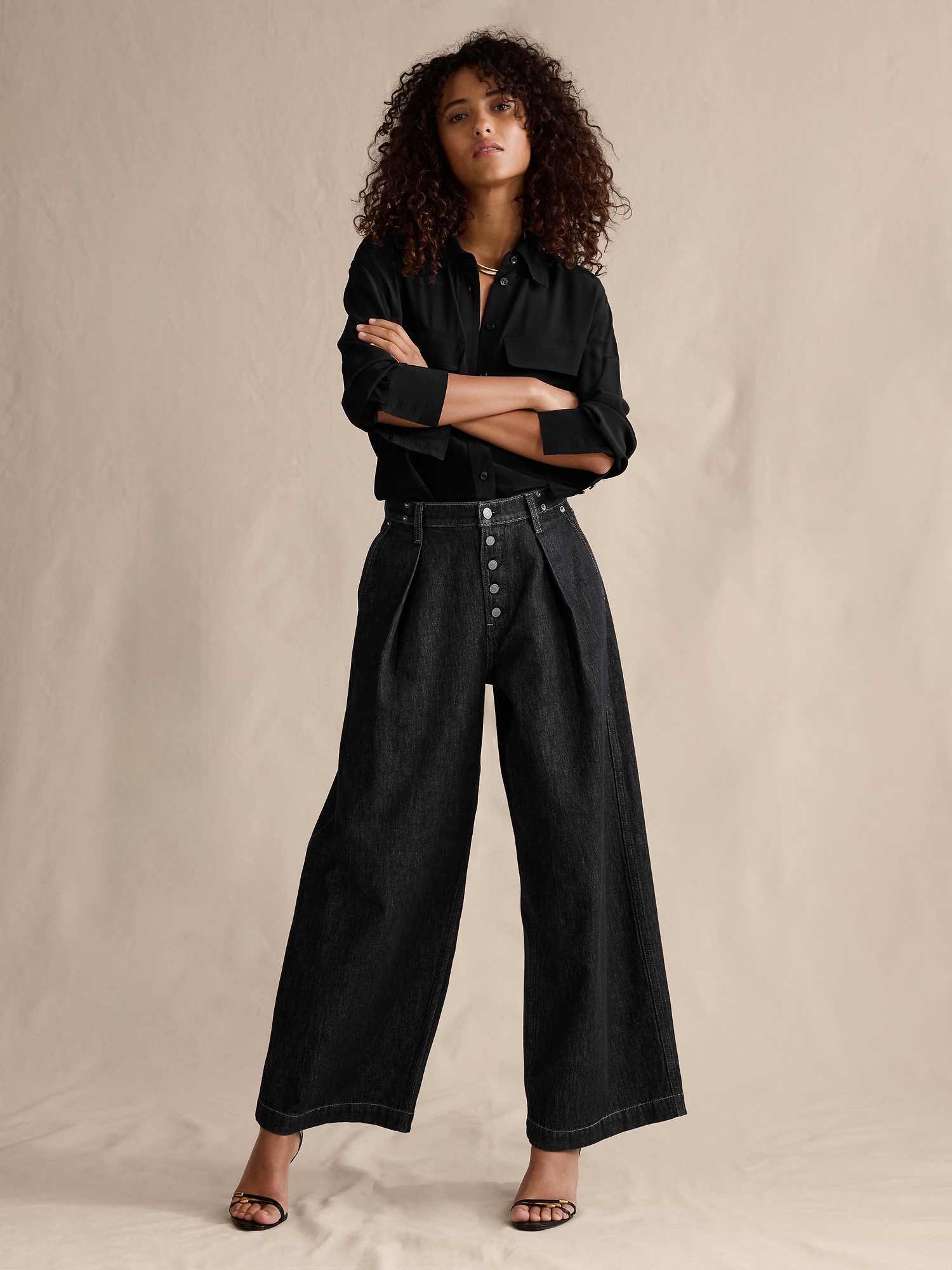 Cute jeans. We borrowed some tailored elements from a pair of vintage trousers (like the pockets and pleated front), but kept the fit slouchy and low on the hips. Cut from certified regenerative cotton and washed for lived-in softness.