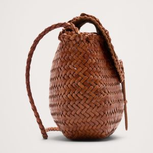 The Mini City Bag features a thin crossbody strap and delicately woven leather, with a slender leather strap closure to keep things secure.