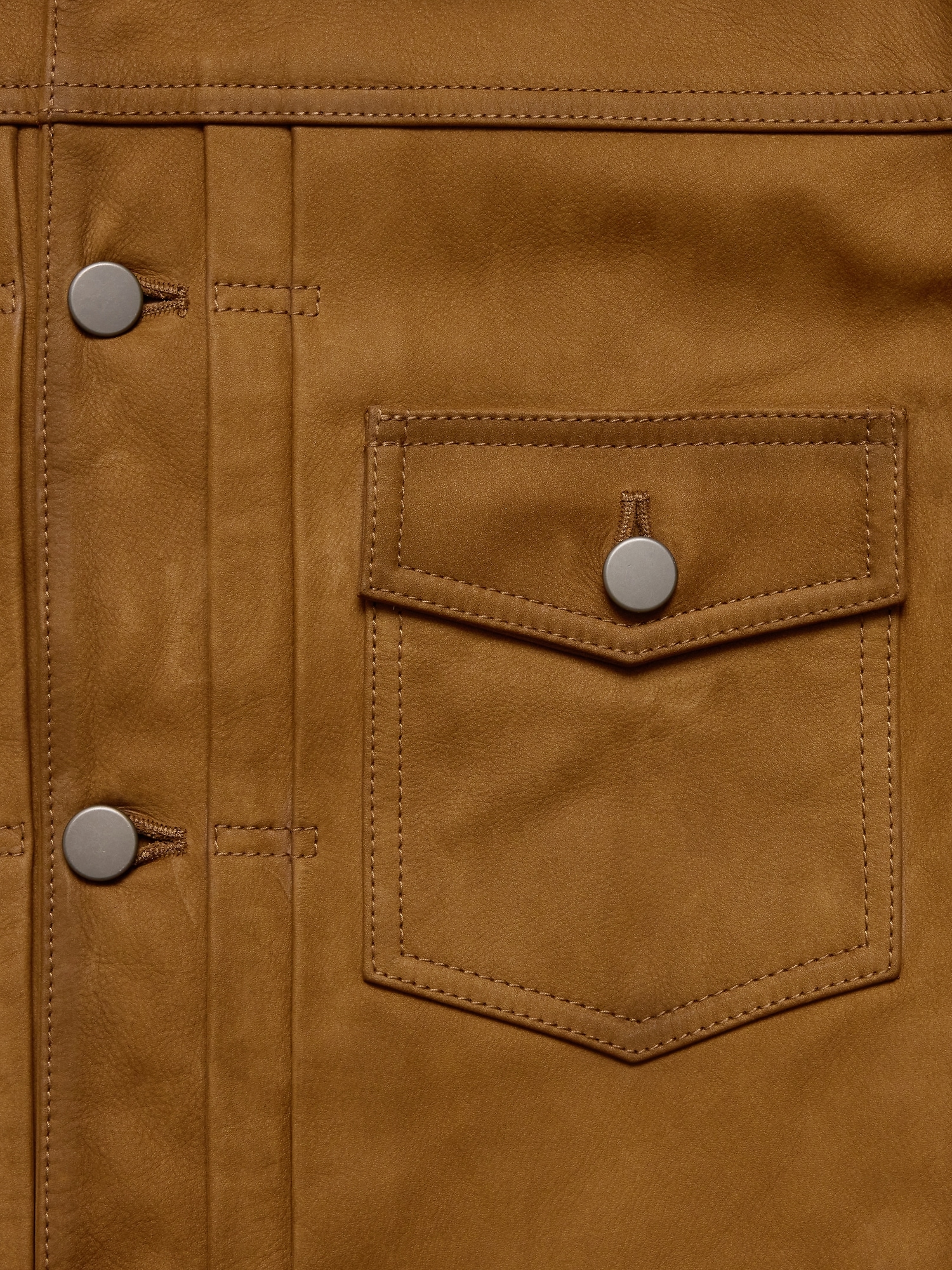 Notice the vertical pleats at the placket and the chest pockets that sit a little lower, we merged details from Type 1 and Type 2 trucker jackets in heirloom-worthy nubuck leather, from one of the world’s most renowned ateliers.