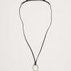 A coiled silver ring suspended from a simple, leather cord, finished in 999-silver plated brass.