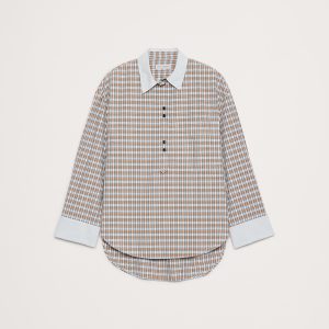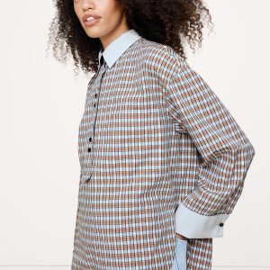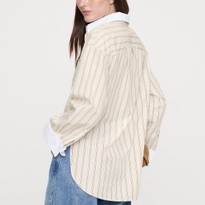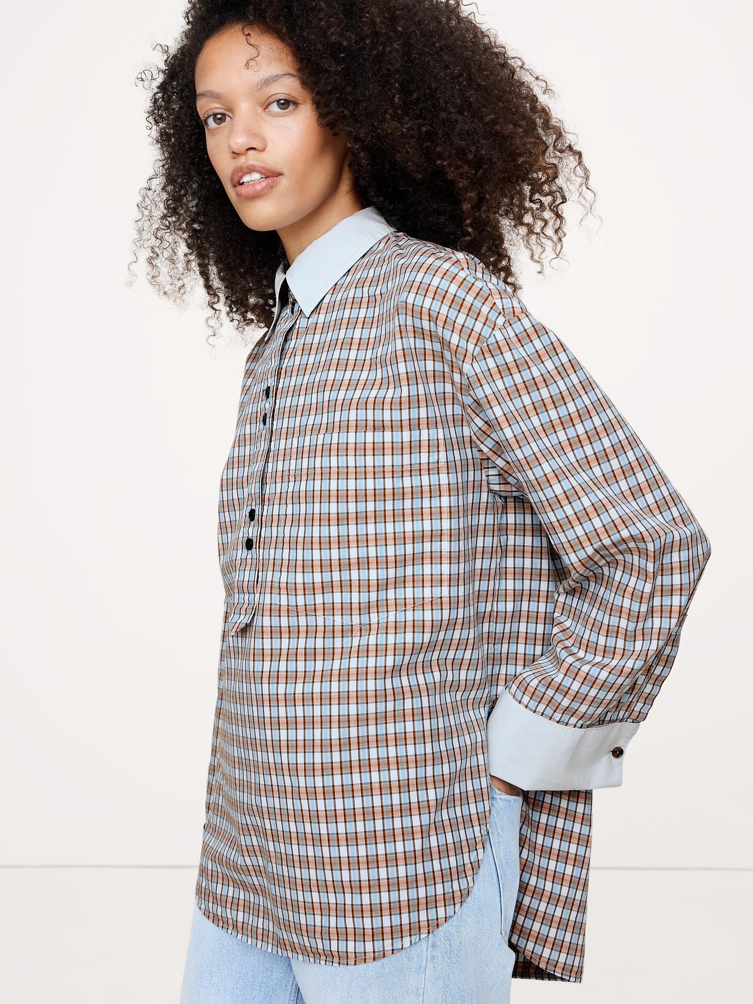 Also known as a \”Banker collar\” shirt, we reimagined this classic silhouette with its distinctive contrast collar and cuffs as an oversized tunic, in our signature 100% cotton poplin.