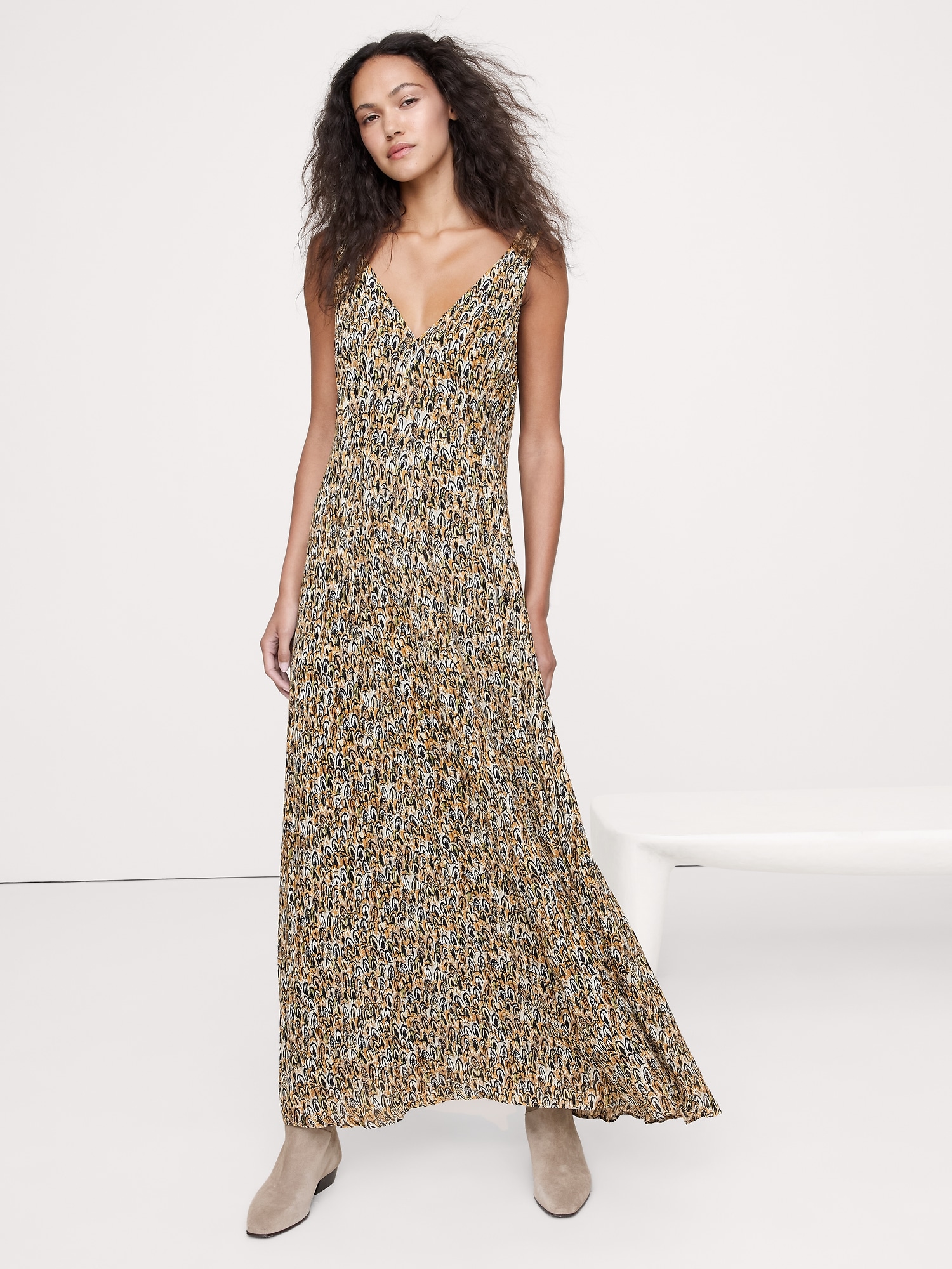 There’s so much to love about this maxi dress: the flowing silhouette, the low back, the adjustable slider straps, and the delicate pintucks. Cut in a matte, printed fabric that’s easily dressed up or down.