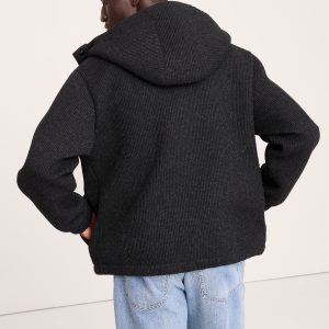Inspired by vintage stadium jacket, we cut this one in a very cool ribbed scuba fabric woven with a touch of wool for added warmth. Use the drawstring at the hem to exaggerate the blouson silhouette.