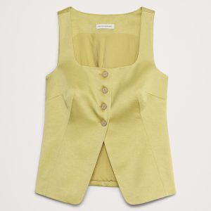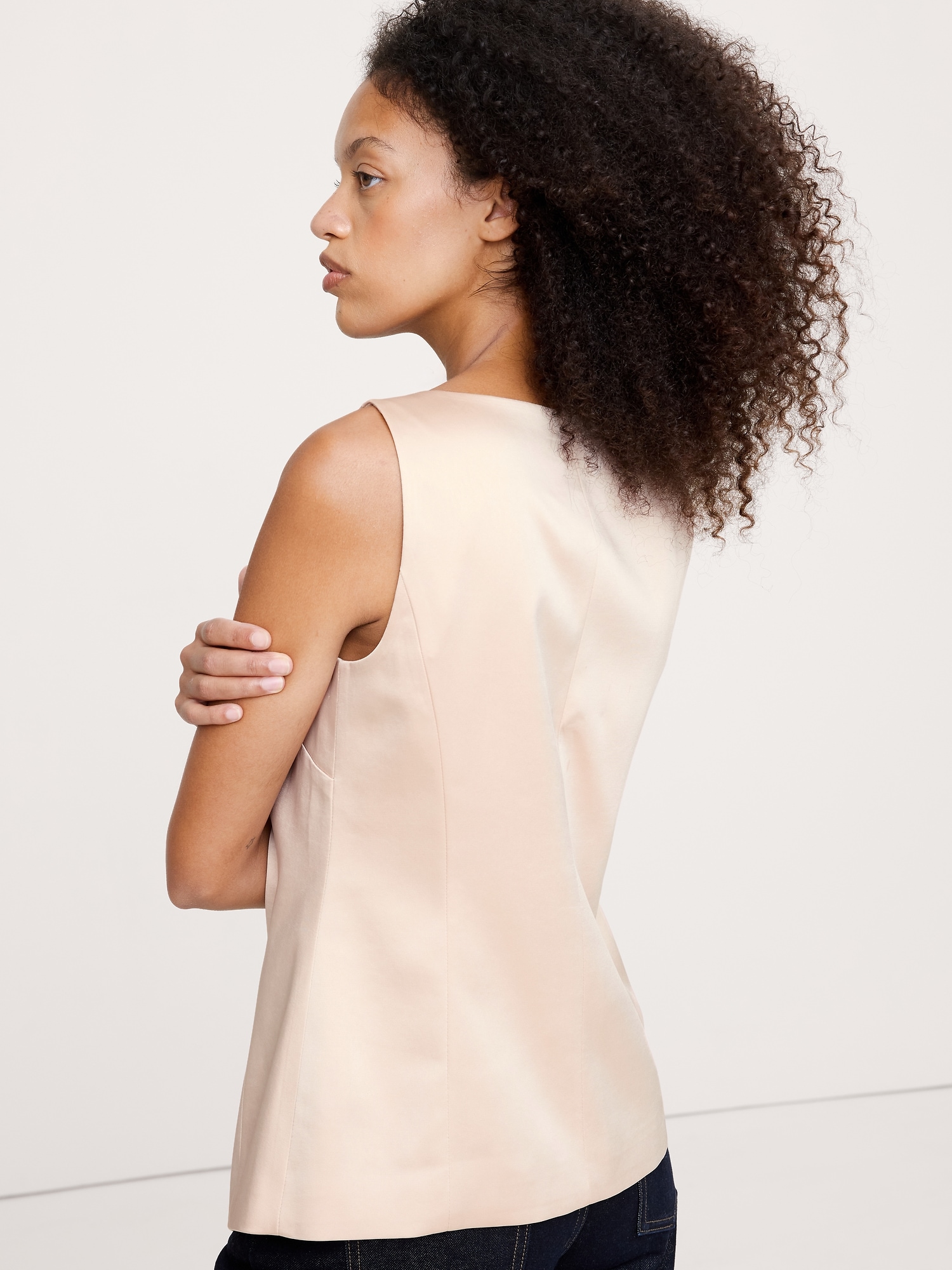 We cut this square-neck vest in a longer length with a square neckline, in a soft satin fabric. Make it a set with the matching kick-flare pant.