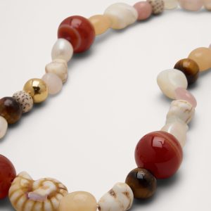 Introducing the Seaside Necklace, filled with playful details, precious stones, and freshwater pearls. The subtle caramel and cream colors give it an understated elegance.
