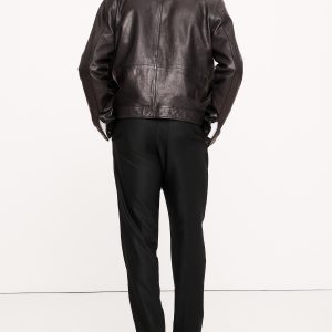 Zip fly with button closure. Front and back crease.
