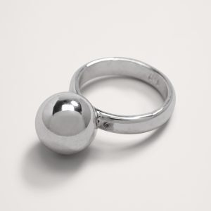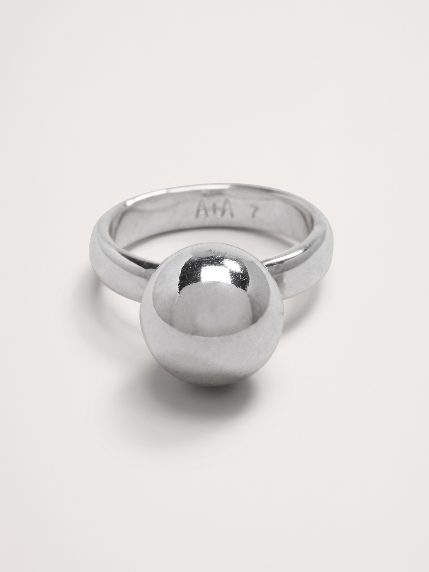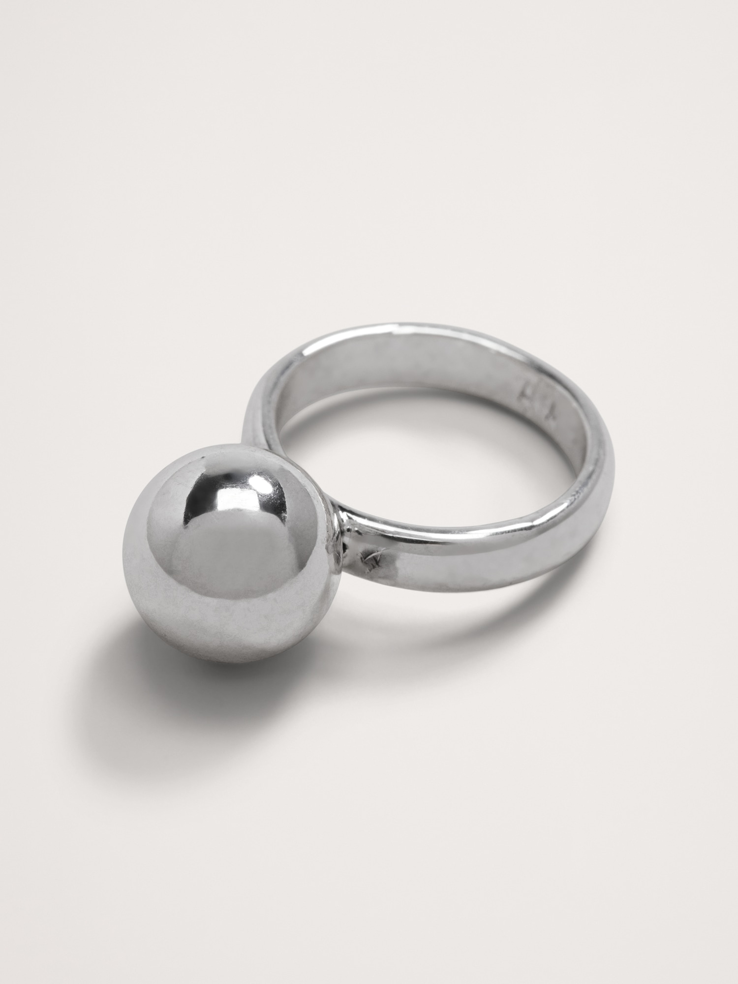 A shining hollow cast sphere adorns a gently curved band on this sleek ring.