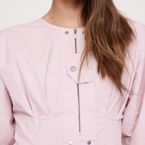 Zip front placket with snap tab details.