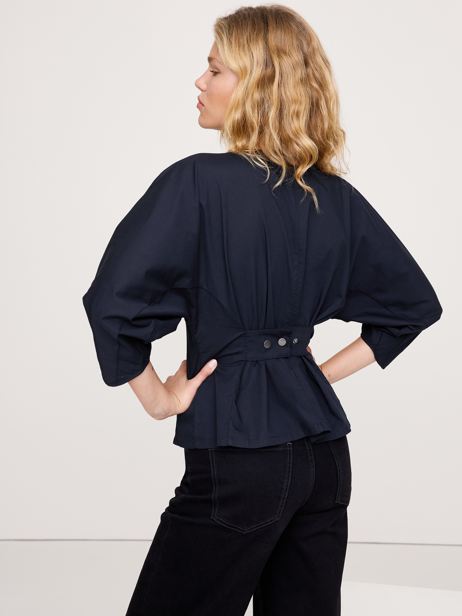 A shirt that says \”I got this\”. We reimagined utility details to create a twist on the classic button placket, seen here in a balloon-sleeve top cut from our stretch-cotton ripstop fabric, with its signature grid texture.