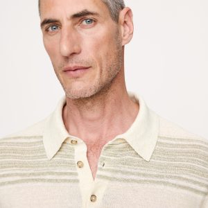 We’re on a mission to make a better-than-vintage sweater polo. Here, a cotton-linen yarn alternates colors to create a retro striped effect with texture.